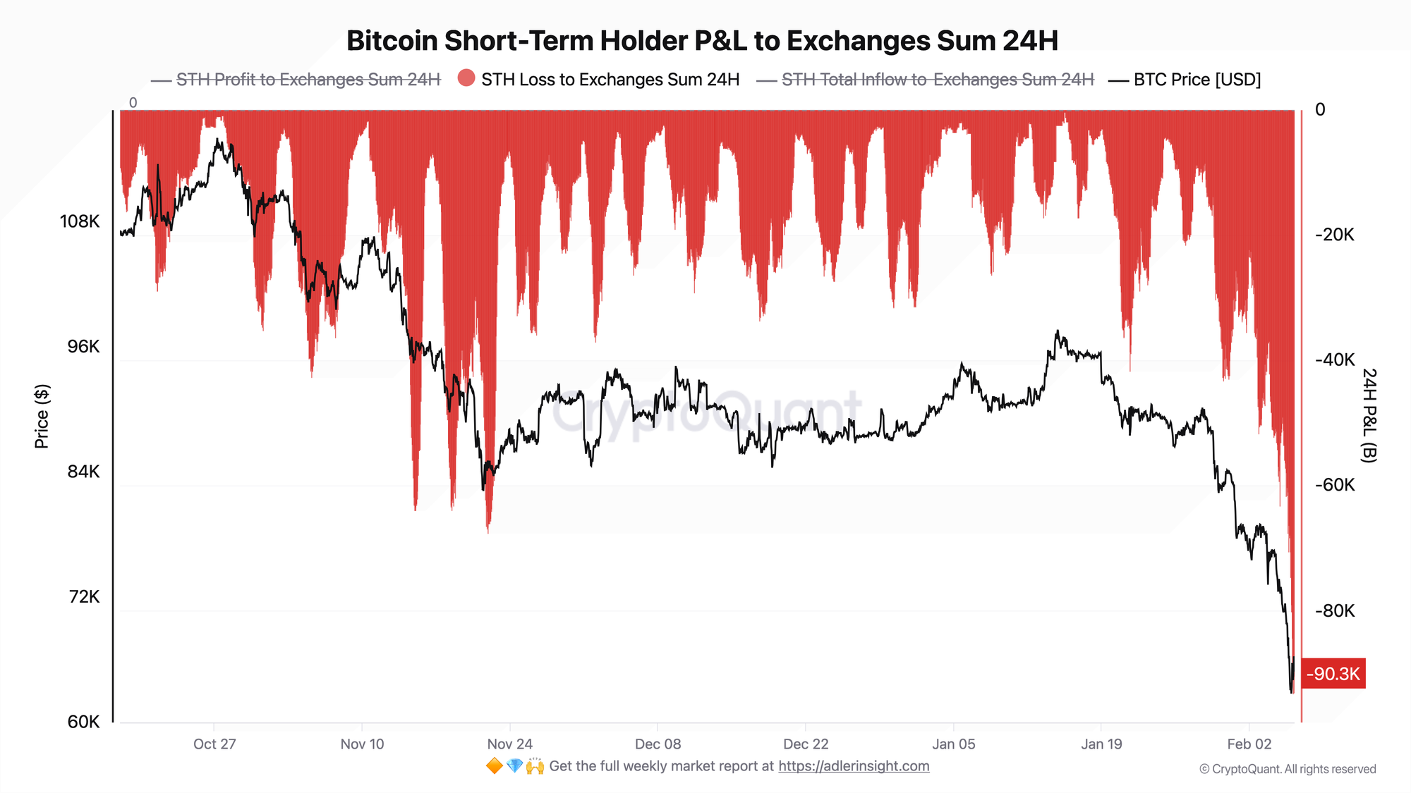 The indicator collapsed to an extreme value of around -90K BTC, the largest dump of STH losses to exchanges in the entire observed period. For comparison: previous local extremes in November reached -40-60K BTC. The current level is double any spike in recent months. Note the structure: the red zone expanded sharply and vertically, characteristic of panic selling rather than gradual distribution.
