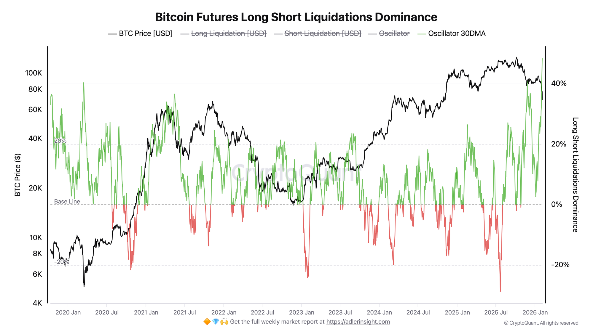 The oscillator measures the dominance of one side in liquidations: values above zero indicate long liquidation dominance, below zero indicates short liquidation dominance. The 30-day moving average smooths out noise.