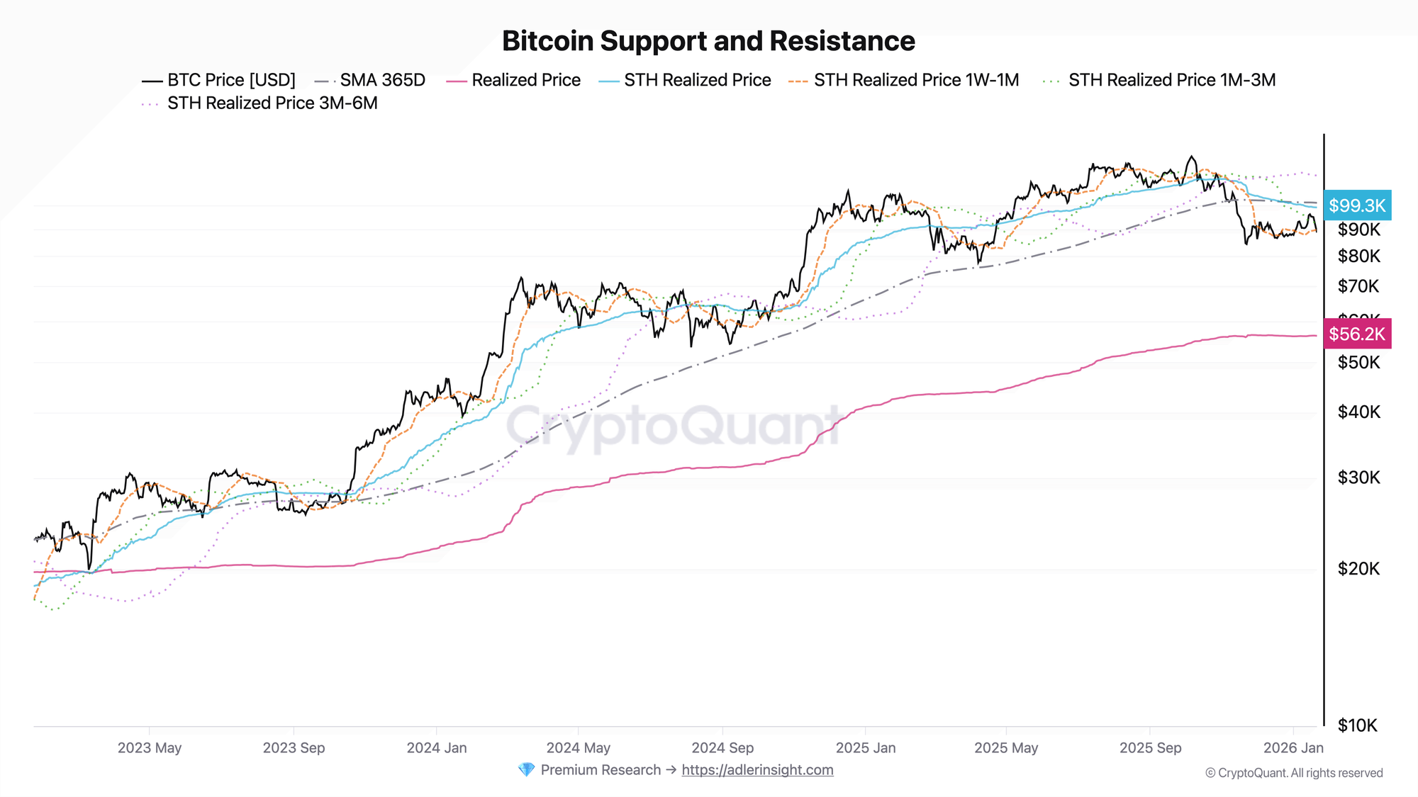 The metric displays the Realized Price of various short-term holder cohorts as dynamic support and resistance levels.