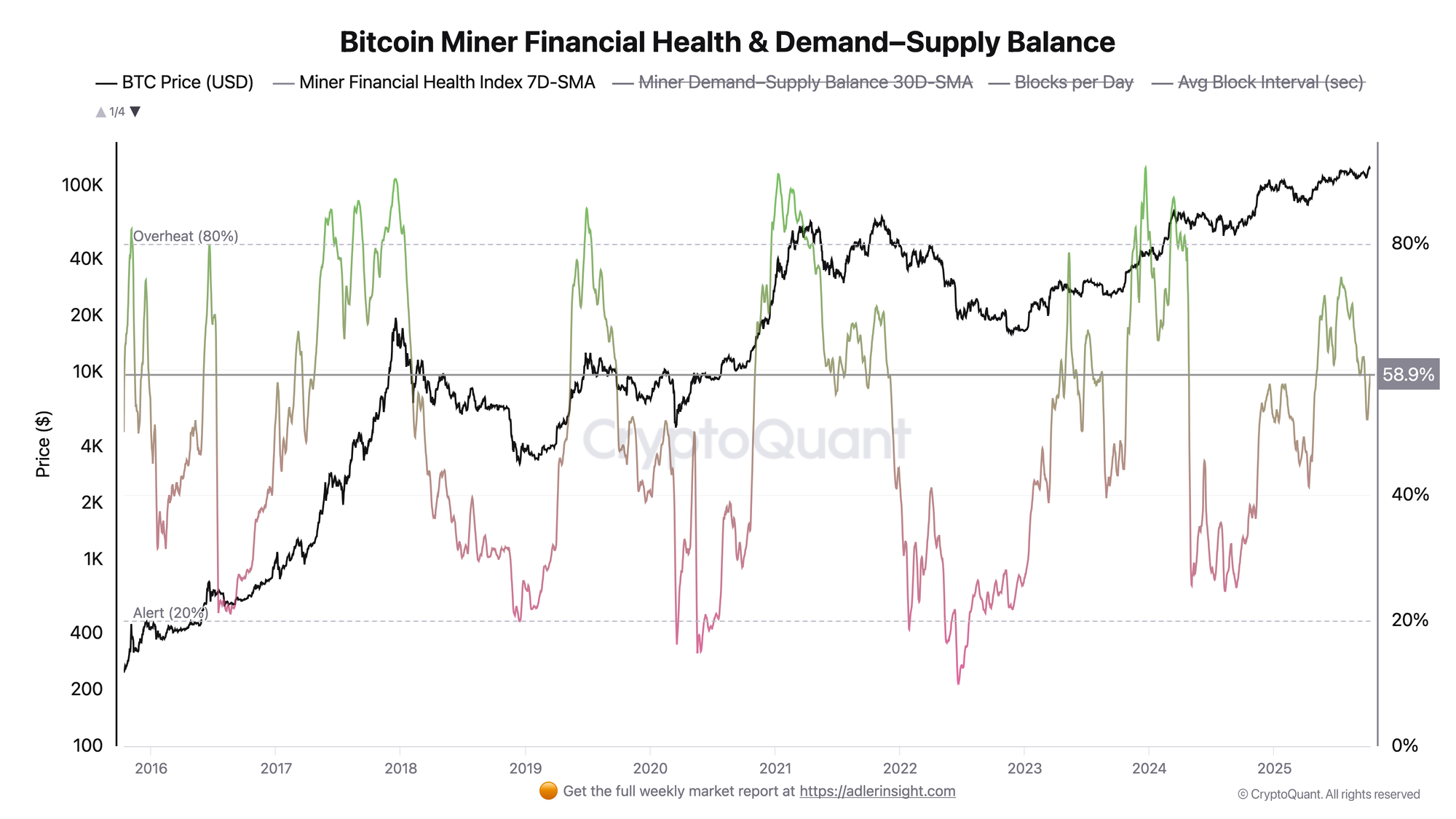 The metric evaluates the real economics of miners, combining four key indicators: hashprice, block profitability, fee share, and total miner revenue. Thanks to logistic calculation and the 0-100 scale, the index reflects not just profitability, but the balance between profit, difficulty, and fee activity.