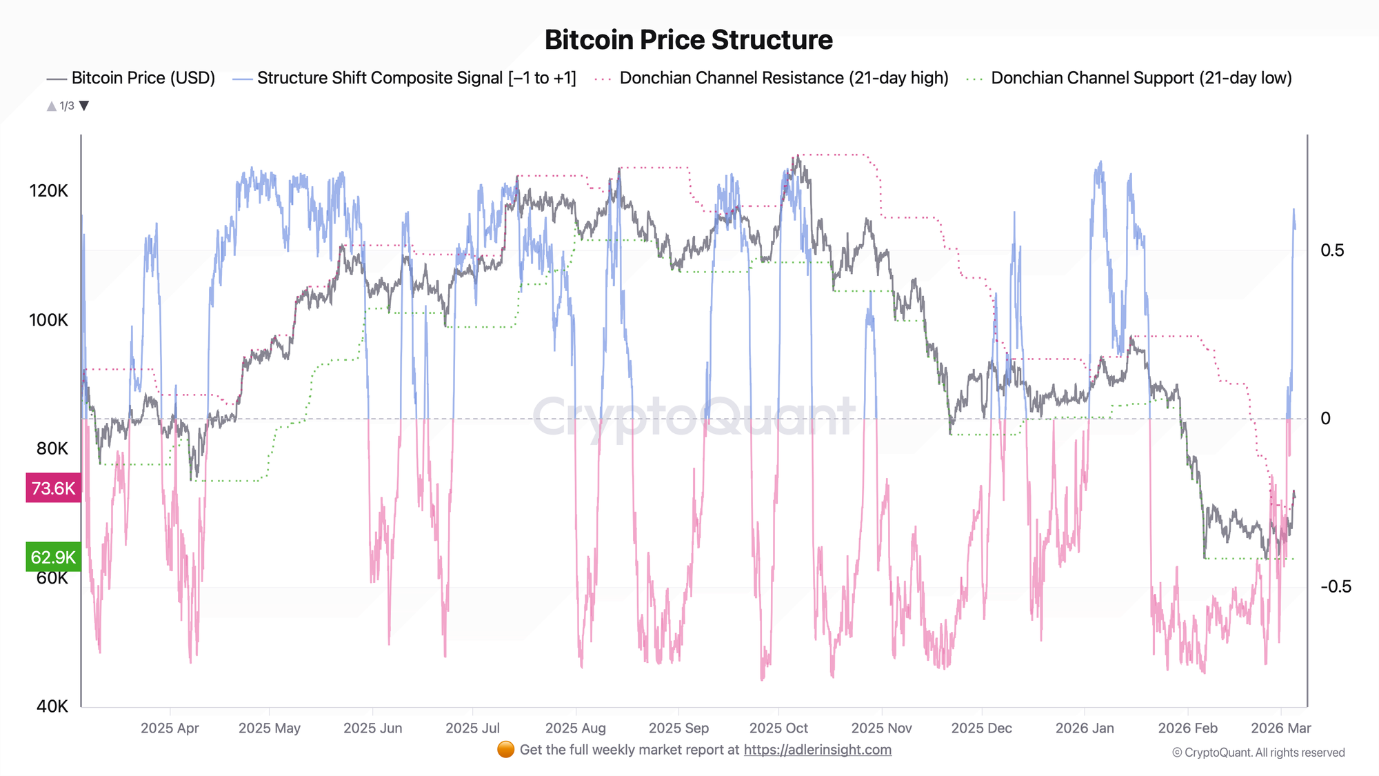 The most recent bear episode - with a low of -47 on February 7 - ended with the zero crossing on March 4. The recovery pace (25 days across a 48-point range) is proportionally faster than all previous deep bear episodes. The simultaneous move of Structure Shift Composite into positive territory confirms that the reversal is reflected not only in aggregated market data, but also in price structure. Current stance is neutral-to-cautiously positive: the signal is there, but one key component (funding) remains negative, and price is pressing directly against Donchian resistance at $73,698.