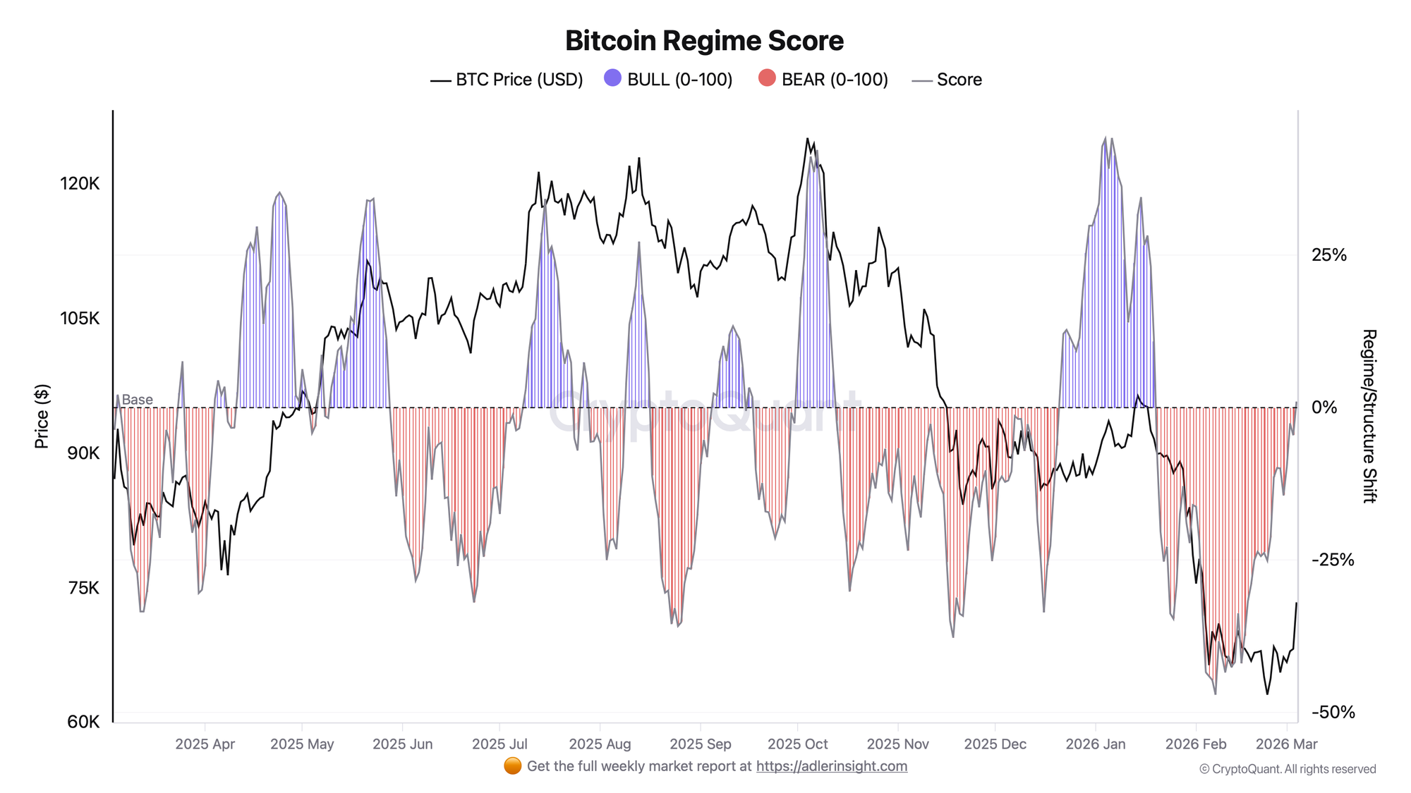 The main trigger for regime confirmation is a close above $73,698 alongside funding normalization. The main risk is a return below $70K, which would push Structure Shift back into negative territory and stall the Regime Score recovery.