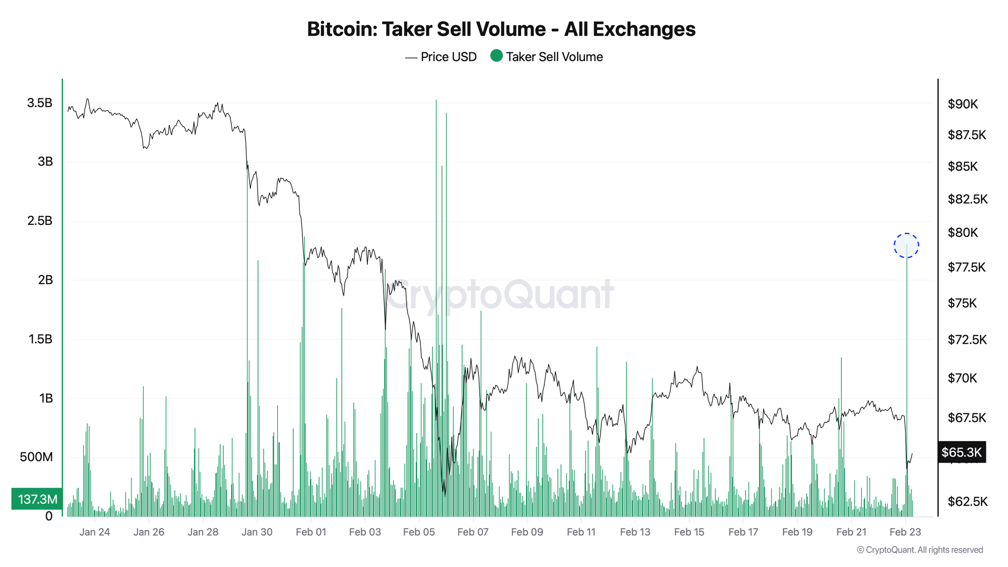 It indicates that a large volume of aggressive market sell orders was executed within a short window - sellers were taking liquidity from order books without waiting for buyers to step in. Such spikes typically coincide with sharp price drops and the triggering of stop orders.