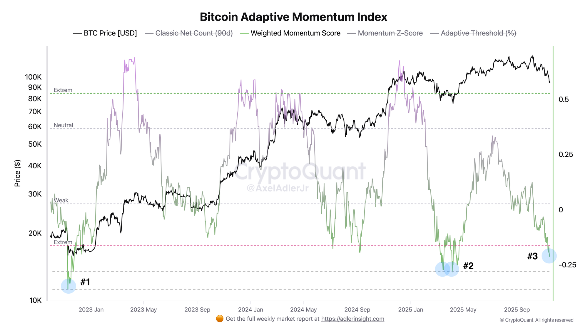 Weighted Momentum Score has dropped into the "Extreme" zone (below -0.20) - the third extreme signal since 2023. The index registers strong bearish pressure. The Weighted Momentum Score metric has broken through the lower threshold and is in the extreme values zone. In bull markets, such extremes marked zones of local/global bottom formation before reversals. The $95K price is trading 12% below Friday's $97.6K and 24% off the October peak of $125K, but market structure has changed, as we wrote in the previous brief, so current signals are perceived differently.