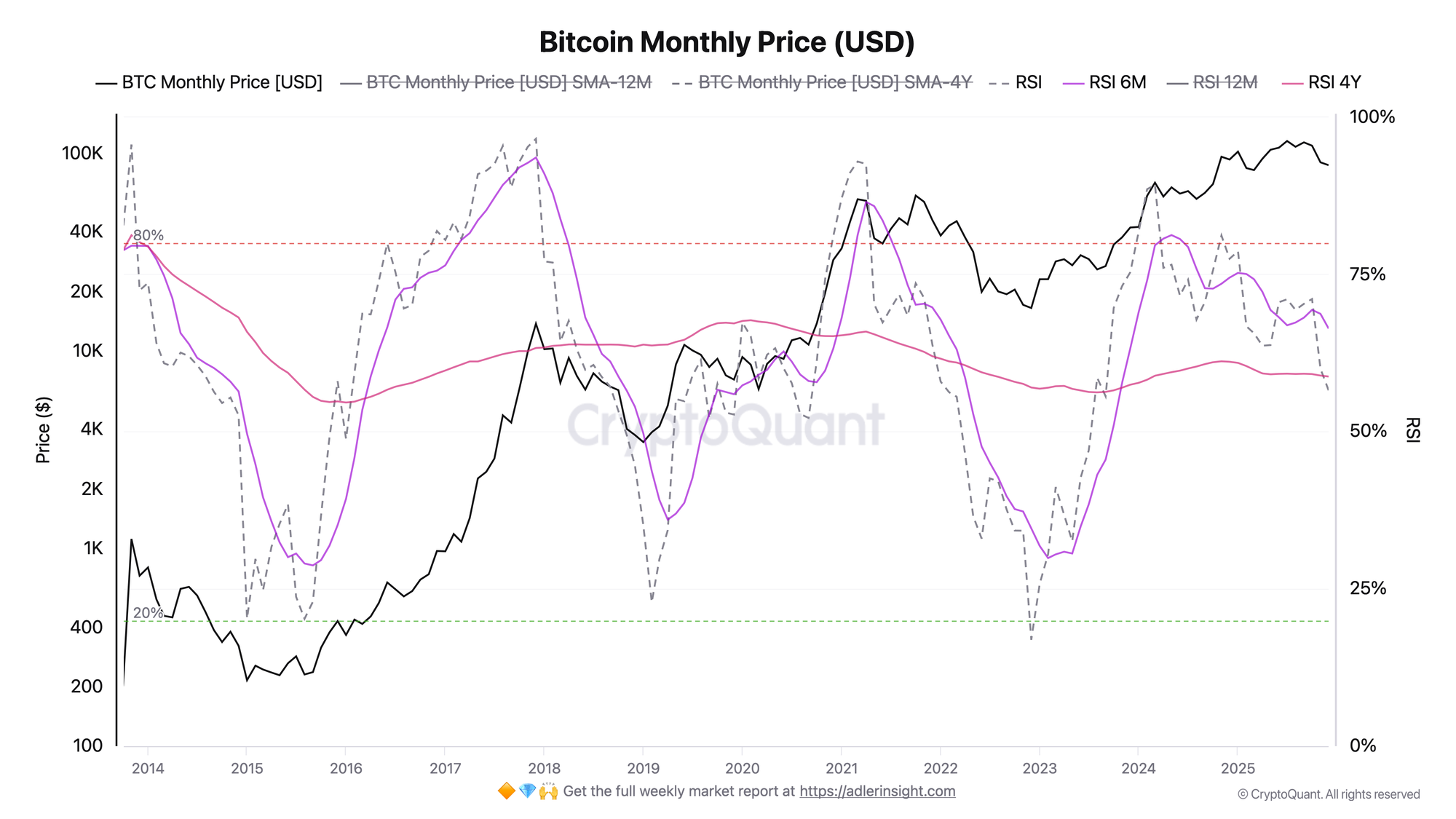Bitcoin lost about one-fifth of its value over the past 3 months and shows negative annual performance. Price structure relative to moving averages and monthly RSI help determine whether this remains a correction within the cycle or signals a deeper reversal.
