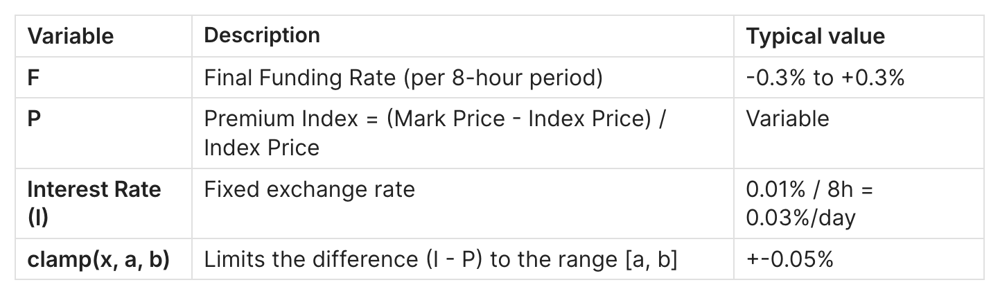 Funding Rate (F) = Premium Index (P) + clamp(Interest Rate - P, -0.05%, +0.05%)