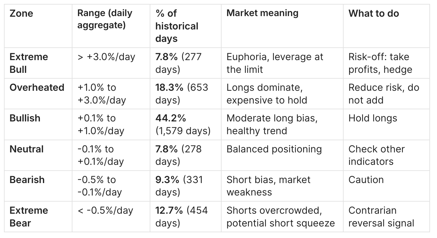 - Key thresholds (daily aggregate, all exchanges): Neutral: +-0.1%/day; Bull overheating: >1.0%/day; Extreme: >3.0%/day; Bear overheating: <-0.5%/day