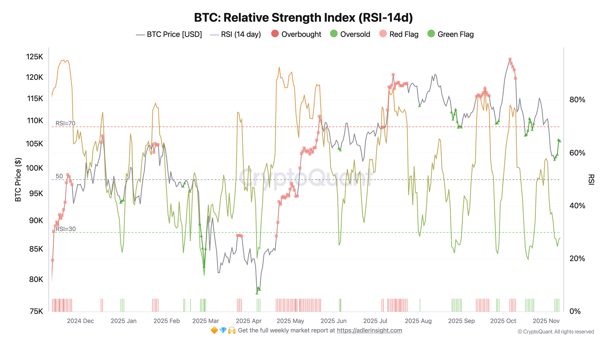 RSI is in the extreme oversold zone at 27%, which has historically preceded local reversals. The indicator has dropped below the RSI=30 level (oversold boundary), forming a green oversold flag. BTC price is trading in the $105K range; the current picture is identical to patterns in January, August, and September 2025, when subsequent rallies pushed the price up from local lows.