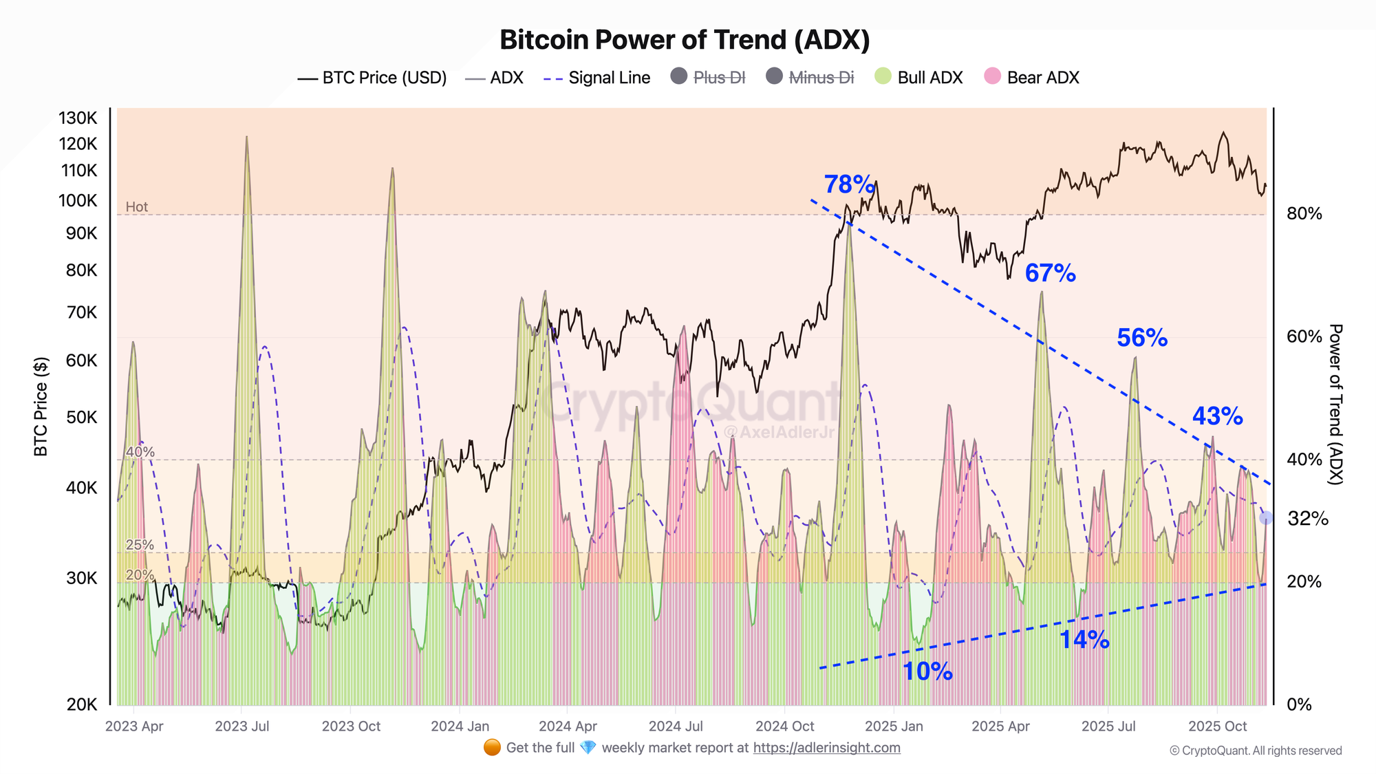 ADX has declined to 32% from a peak of 78% (January 2025), signaling trend weakening. The directional movement index shows a consistent decline from the year's beginning maximum values, when trend strength reached an extreme of 78%. The current value of 32% is in an intermediate zone—above the weak trend threshold (25%), but significantly below the strong directional movement zone >60%. Pink bars (Bear ADX) have contracted; green bars (Bull ADX) are not yet dominant.
