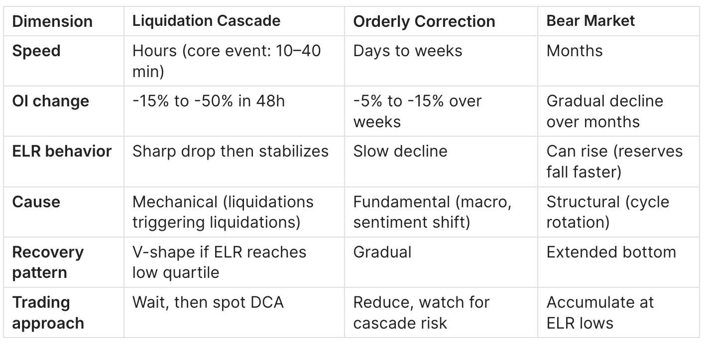 Key lesson: The absolute size of the cascade ($19B in liquidations, $12B OI decline) is less important than whether ELR reaches its lower quartile. October 2025's cascade was the largest ever in dollar terms but did NOT produce an immediate V-recovery because ELR stayed elevated at 0.56.