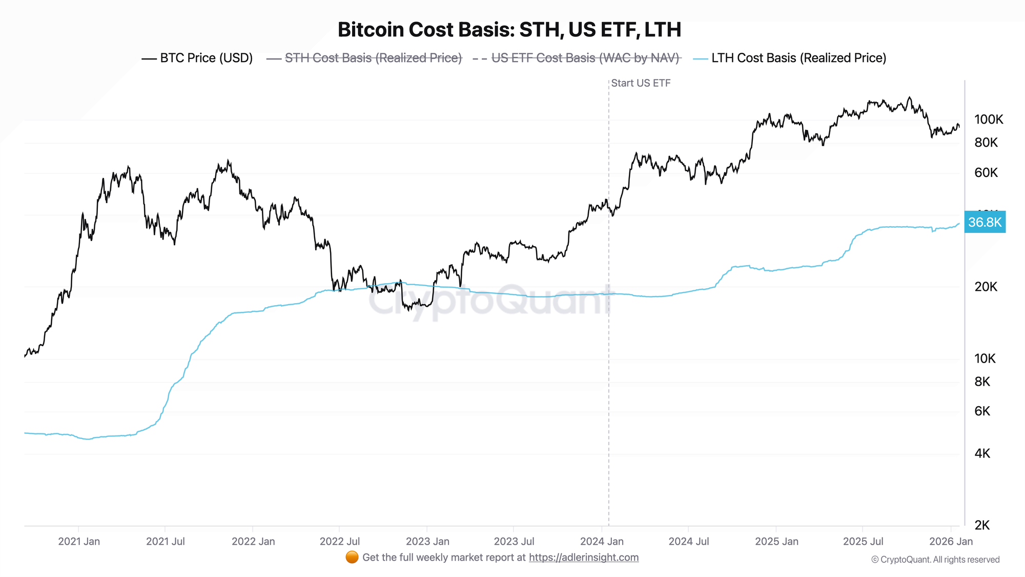 LTH Realized Price represents the aggregate cost basis of Long-Term Holders. Because this cohort holds through cycles, their cost basis is significantly lower and moves slowly. Historically, price touching LTH Realized Price has aligned with generational bottoms-2015, 2018, 2022. These are the moments when even conviction capital is underwater, representing maximum capitulation.