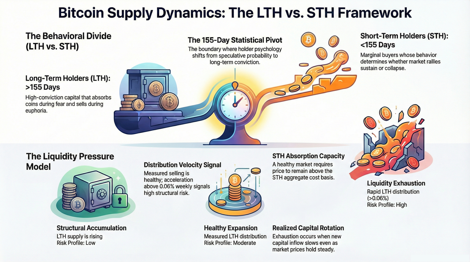 This guide does not simply define LTH and STH. It introduces a diagnostic framework-the Liquidity Pressure Model-designed to detect structural risk, not narrative sentiment. By the end, you will understand how to read the silent war between conviction capital and speculative flows, and why this single framework connects every major on-chain metric from MVRV to SOPR to Realized Price.