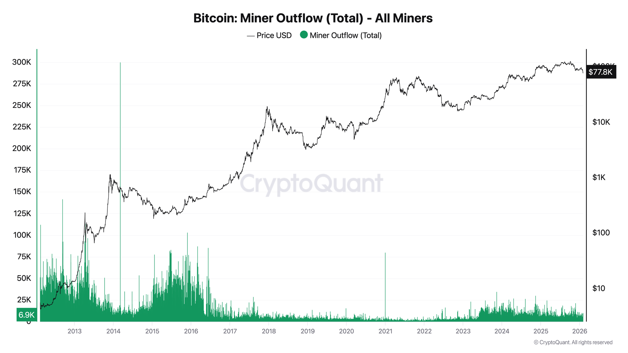 - Current (Feb 2026): Moderate selling, reserve declining slowly - miners stressed but not panicking