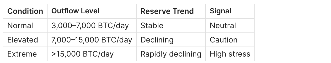 Bearish case: Reserve declining consistently (multi-week trend). Outflow spikes >10,000 BTC. Context determines meaning: