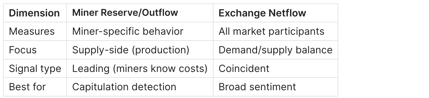 Combined use: Miner outflow increasing + Exchange netflow negative (inflows) = double selling pressure.