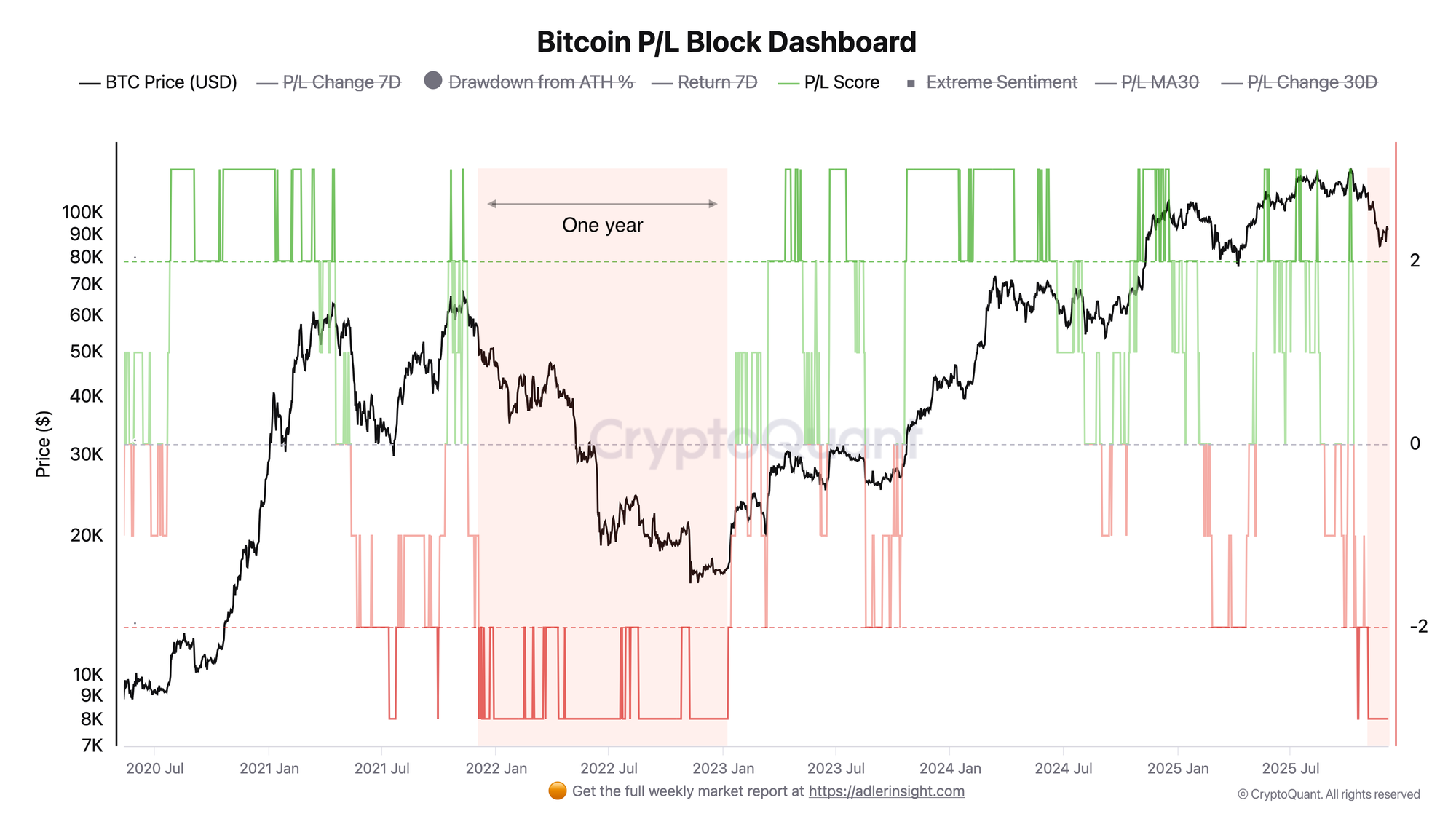 On-chain metrics record bearish signals: P/L Score has been in the -3 zone since November 6, corresponding to the bearish regime of past cycles.