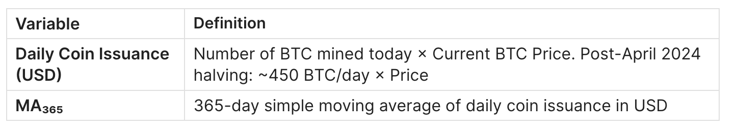 Puell Multiple = Daily Coin Issuance (USD) ÷ MA₃₆₅(Daily Coin Issuance USD)