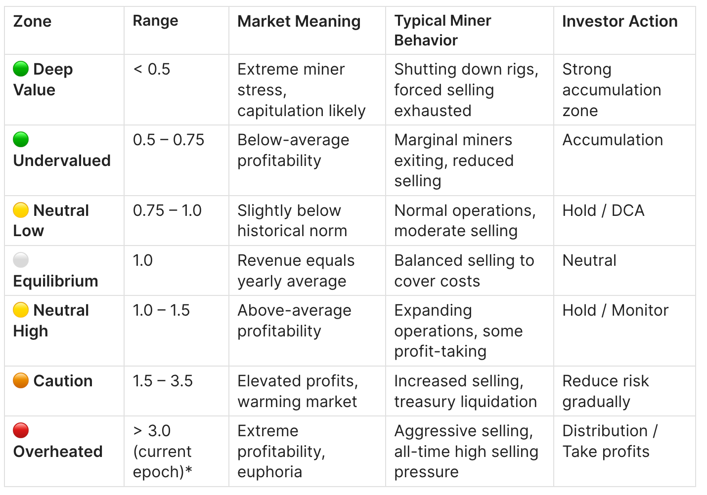 - What it measures: Ratio of daily miner revenue (USD) to 365-day average - shows miner profitability vs. historical norm