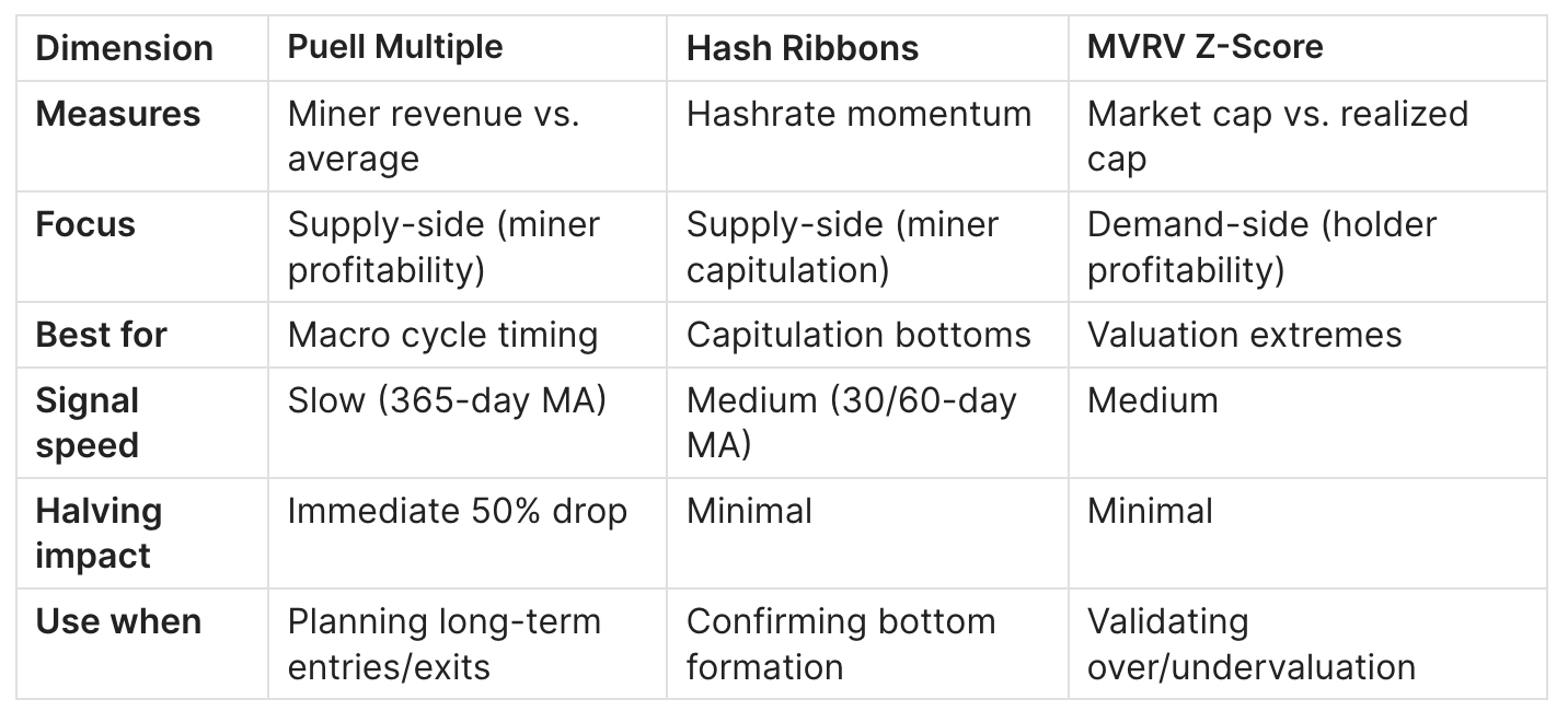 - Puell Multiple vs. Hash Ribbons vs. MVRV Z-Score