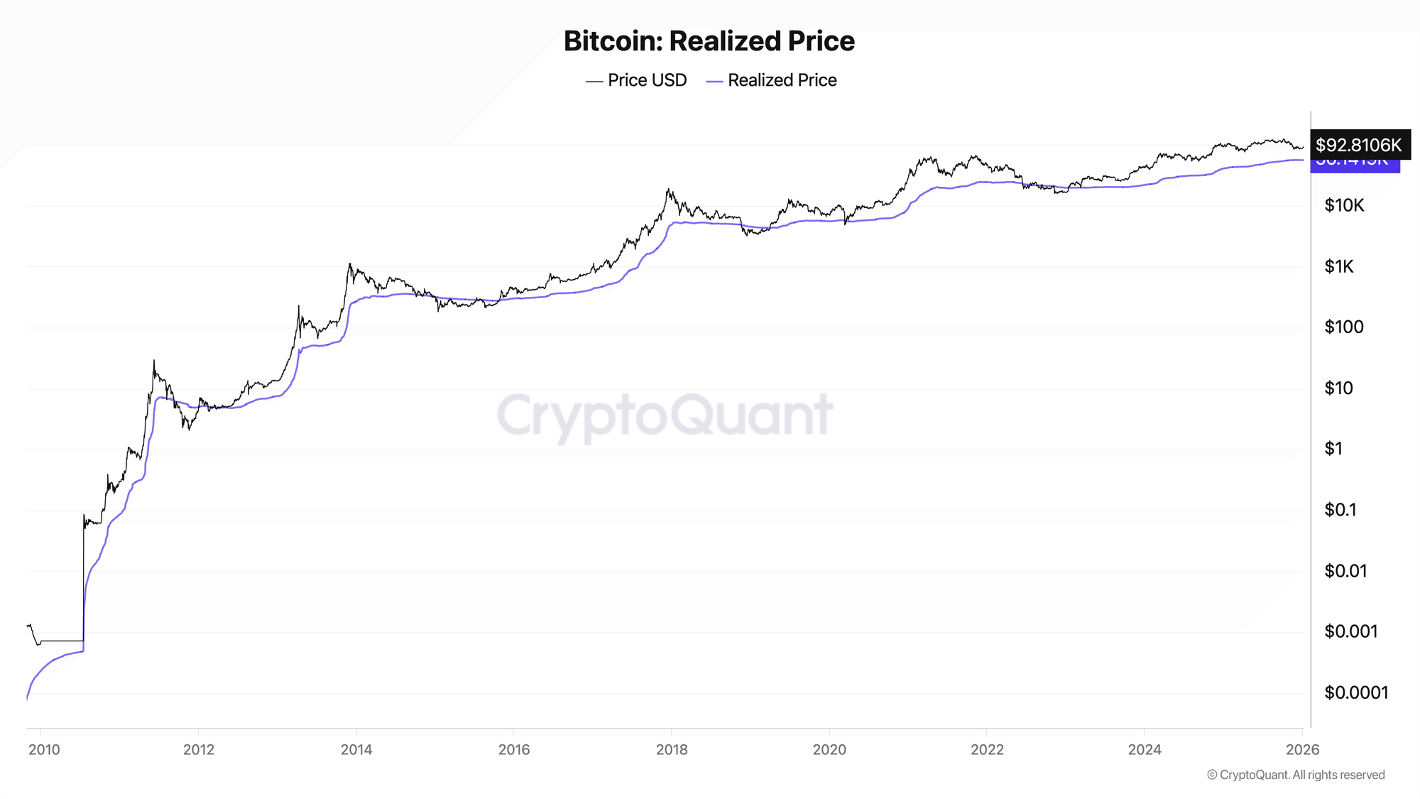Realized Price updates continuously. As of early 2026, Bitcoin’s realized price was in the low-to-mid $50,000 range, depending on methodology and data provider. For real-time values, refer to CryptoQuant or Glassnode.