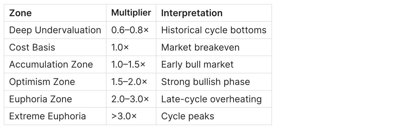 Unlike traditional technical indicators, realized price bands are grounded in on-chain fundamentals. They are derived from Realized Price, which represents the average price at which all circulating Bitcoin last moved on-chain. By applying historically relevant multipliers to this baseline, realized price bands form adaptive valuation zones that have remained consistent across multiple Bitcoin cycles.