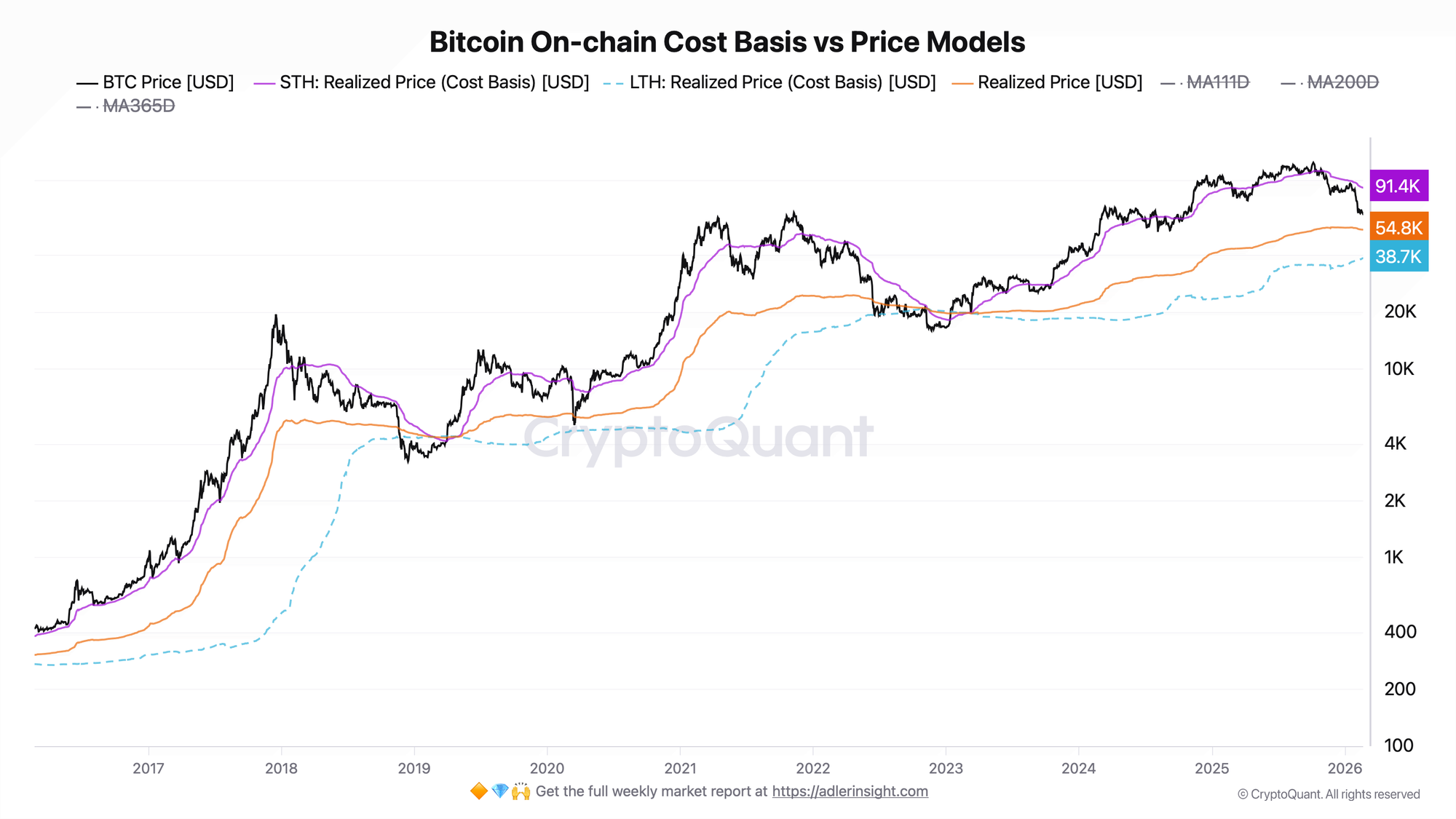 The metric displays the network cost basis across three levels: Realized Price - the average acquisition price of all coins in the network, STH Realized Price - the cost basis of short-term holders, and LTH Realized Price - of long-term holders. Each level serves as a potential support zone or source of pressure.
