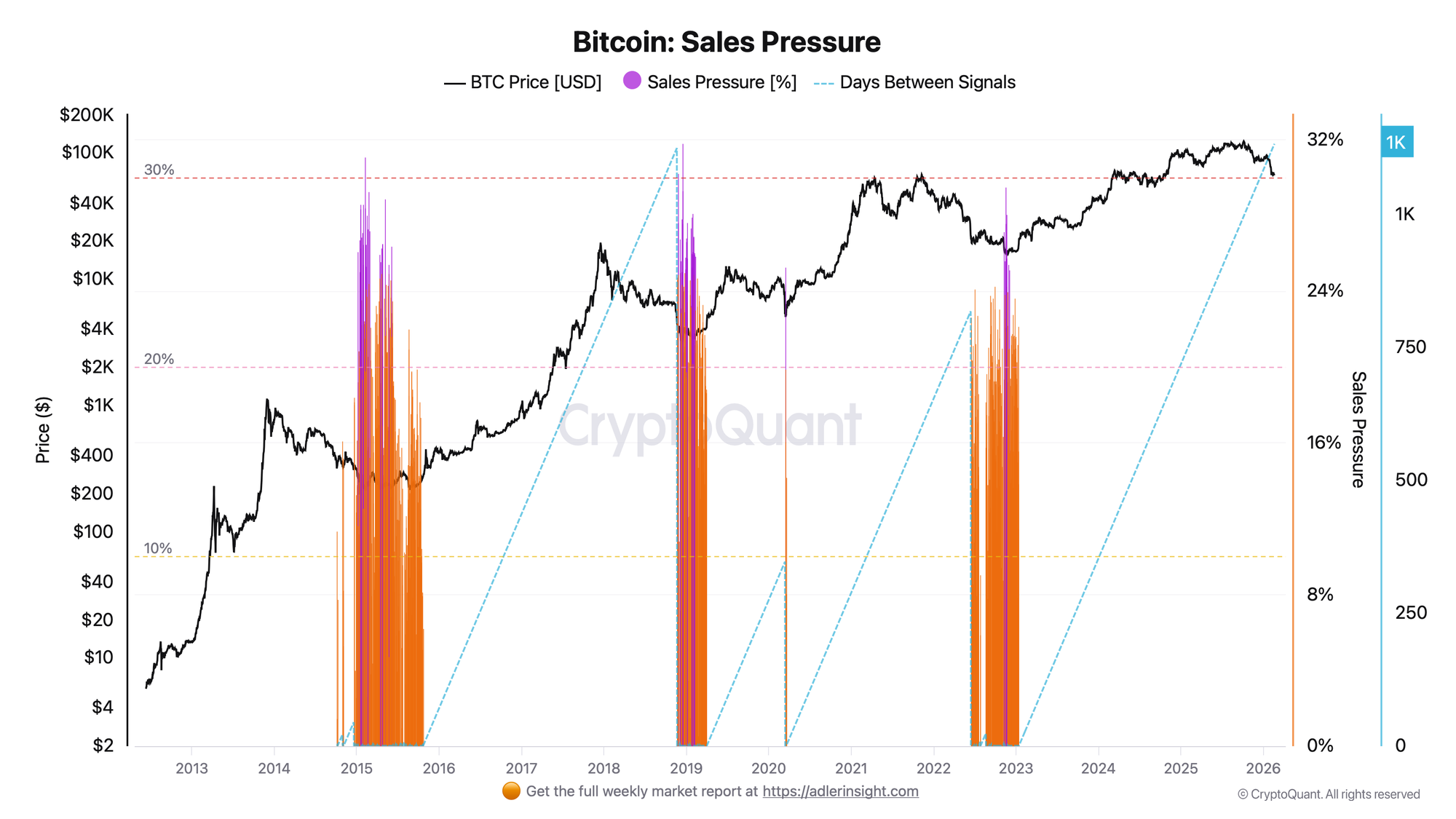 The strong selling pressure signal has been absent for 1133 days: the market remains above Realized Price ($54,803). Activating pressure would require a decline of approximately 22-23% from current levels - historically, such events occurred only during cyclical bear market phases.
