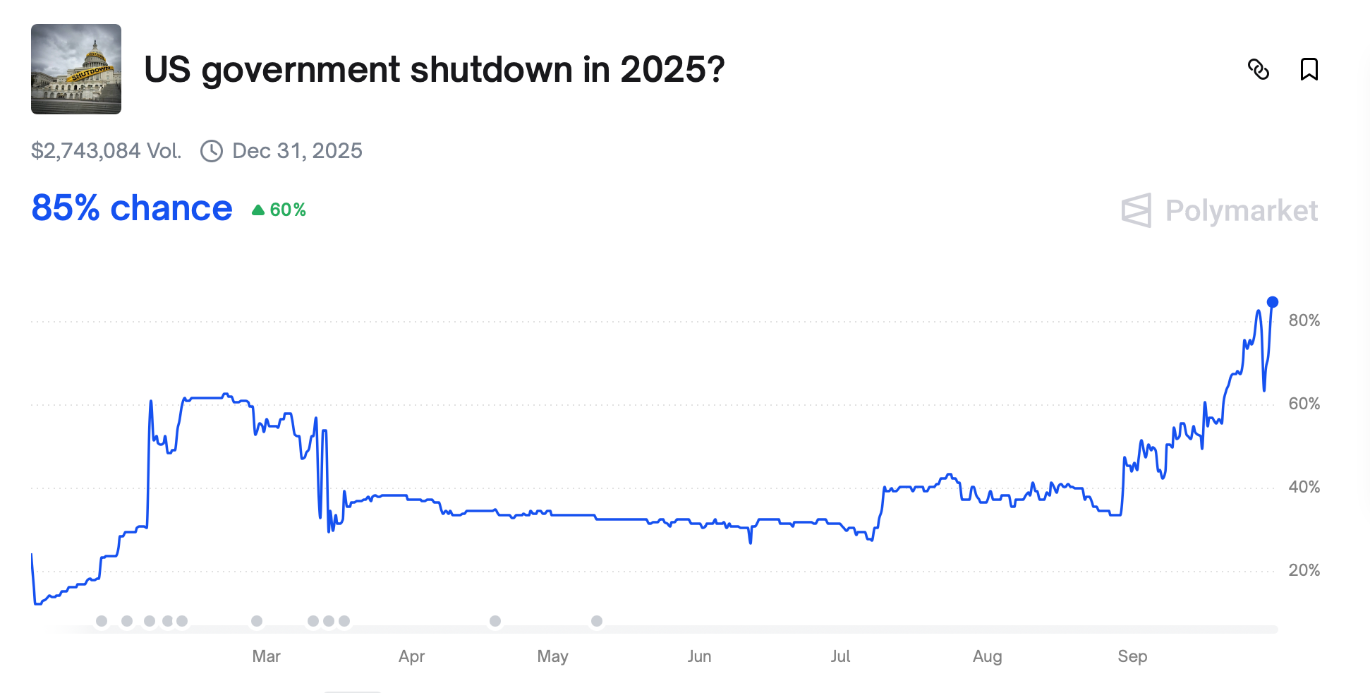 On prediction markets, such as Polymarket - they currently estimate the risk of a 2025 shutdown at approximately 84%.