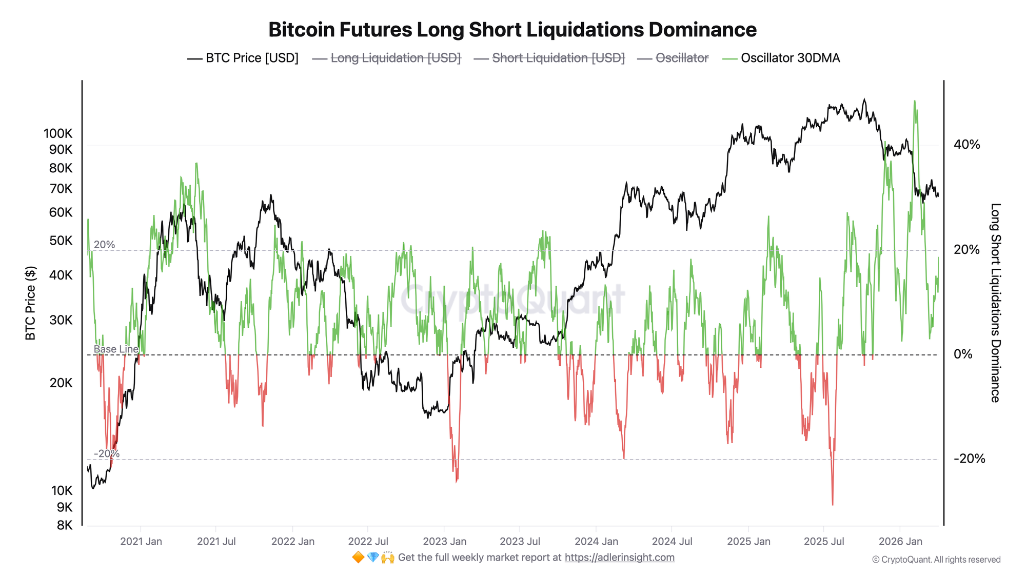 The liquidations dominance oscillator reversed upward from a level of 2.9% in mid-March and has risen steadily since, reaching 18.6% today. This means the market is consistently generating liquidations on the long side, not allowing the structure to recover. The red bars reflecting short liquidation dominance have been absent since October 2025.