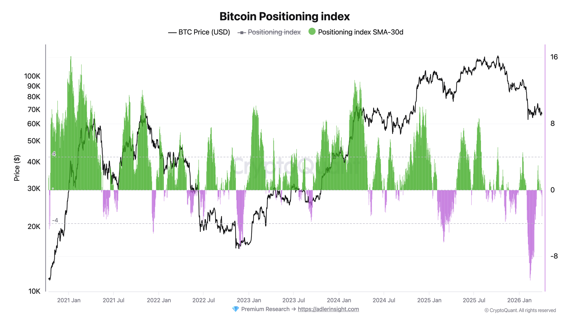 Positioning Index is a synthetic indicator of aggression in the derivatives market: it shows which direction futures market participants are actually opening positions right now. The SMA-30d of the index reached a local peak of +3.0 on March 17 at a price of $73,925 and has since reversed, declining to -3.1 today. Over two and a half weeks, the moving average crossed below zero and continued lower, reflecting a sustained buildup of bearish positioning. Over the same period, price dropped from $74,883 to $66,603, with the SMA-30d declining in sync with the market, confirming the weakening structure.