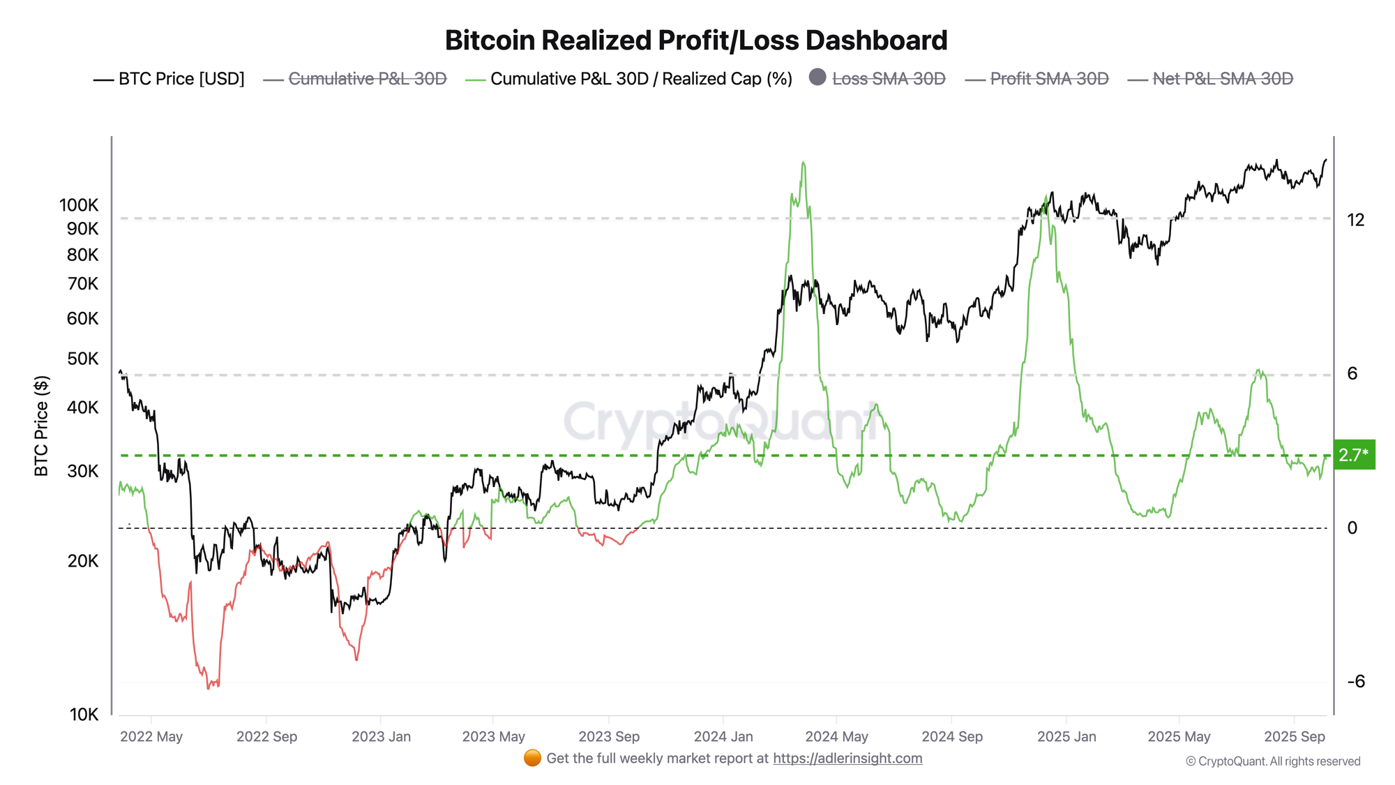 The metric shows the share of realized result (profit–loss) over 30 days relative to Realized Cap. In the 1–4% zone, the trend is usually healthy, demand absorbs sales. Sustained expansion to 5–6%+ precedes intensified selling and 10–20% pullbacks.