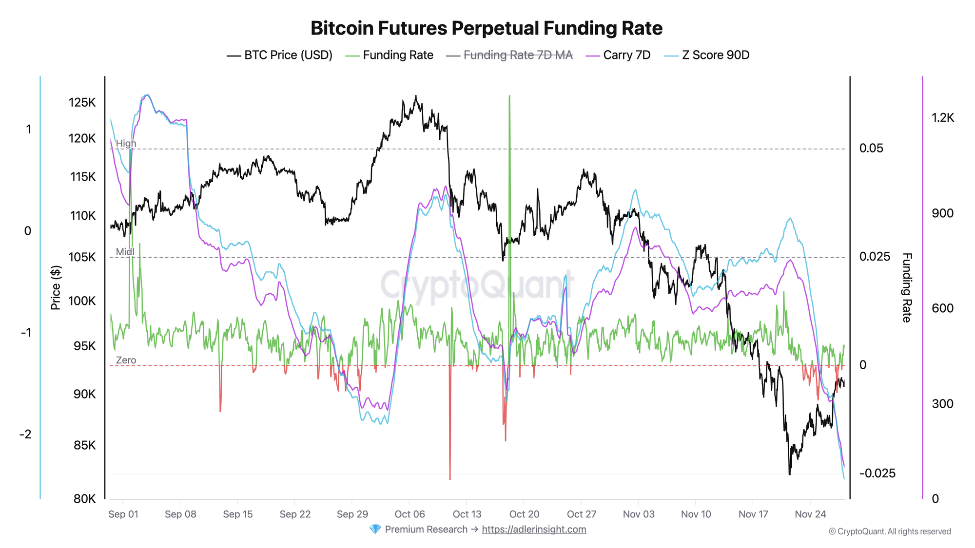 Key indicator - Z-score -2.45: funding is 2.5 standard deviations below the 90-day mean. Such extremes (Z-score < -2) most often appear in two scenarios: (1) completion of an overleveraged rally before consolidation (current scenario), or (2) funding reset before a fresh leg up. The divergence between the 7-day trend (0.09%) and 30-day baseline (0.52%) shows how aggressively funding is cooling.