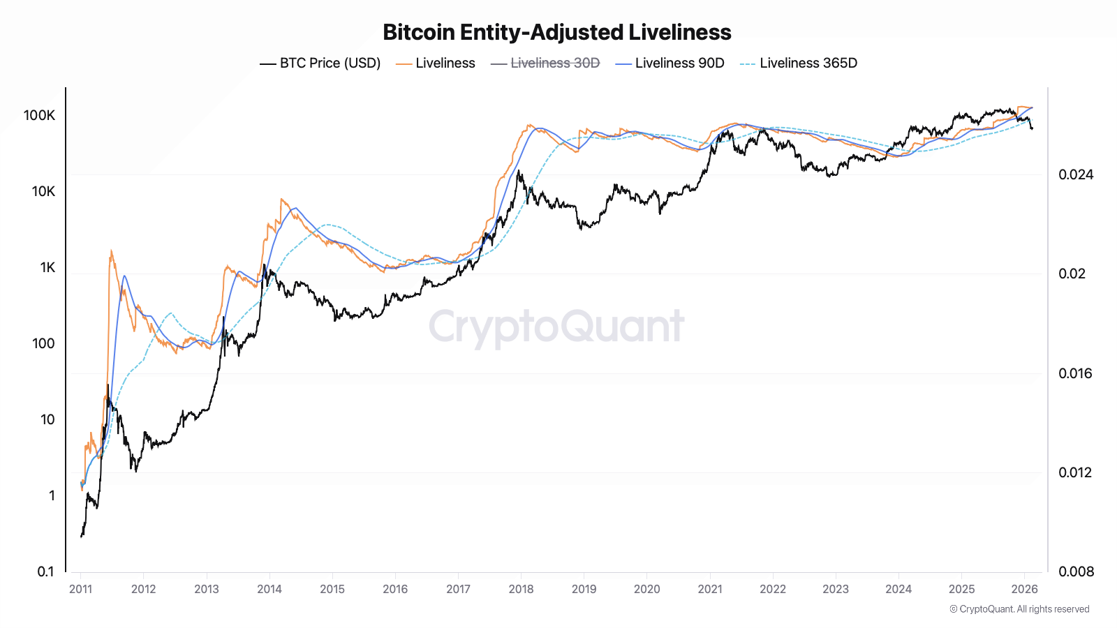 Note: Values in this guide reflect entity-adjusted CDD from CryptoQuant, which filters self-transfers between wallets of the same entity. This produces lower absolute readings than raw Liveliness — focus on directional trends, not absolute levels.
