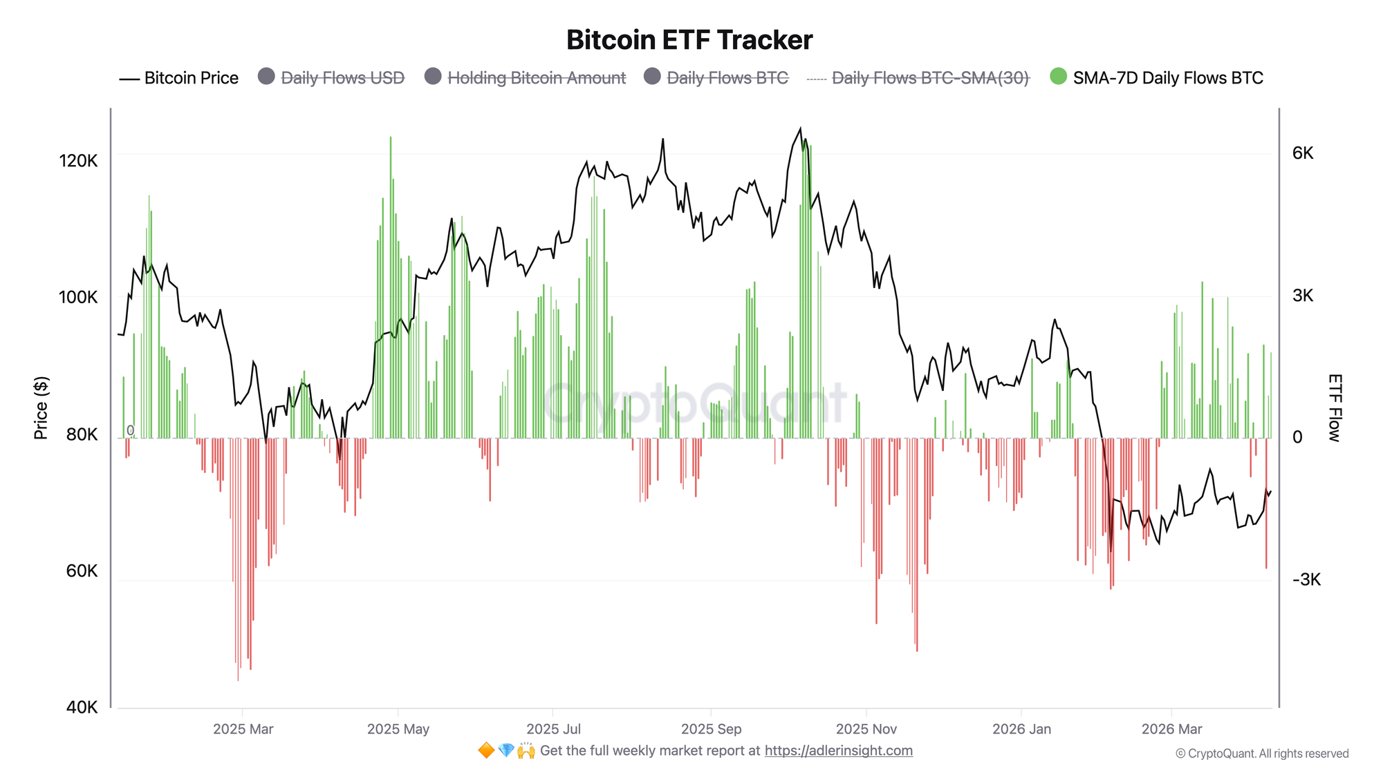 The key question now is whether the April 7 drop was a one-off anomaly or the beginning of a more unstable phase in ETF flows. If the negative episode turns out to be isolated, SMA-7D will continue to stabilize. If negative days start repeating, the structure will deteriorate again.
