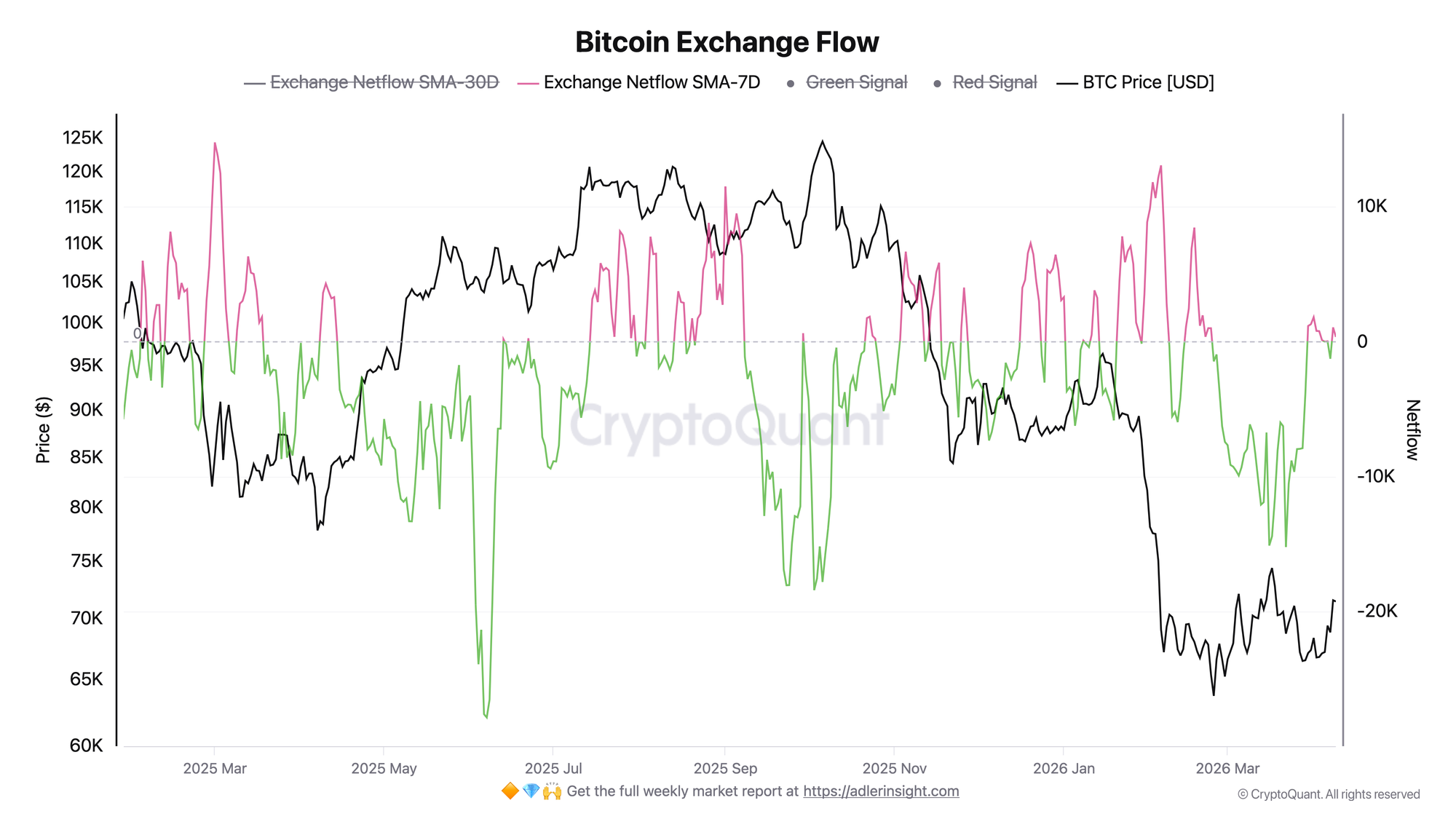 What does the neutralization of Exchange Netflow SMA-7D near zero mean? The metric reflects the 7-day average balance between BTC inflows and outflows on exchanges. A value near zero means neither side is currently dominant: the market has exited the extreme net outflow phase and moved into a more neutral state.