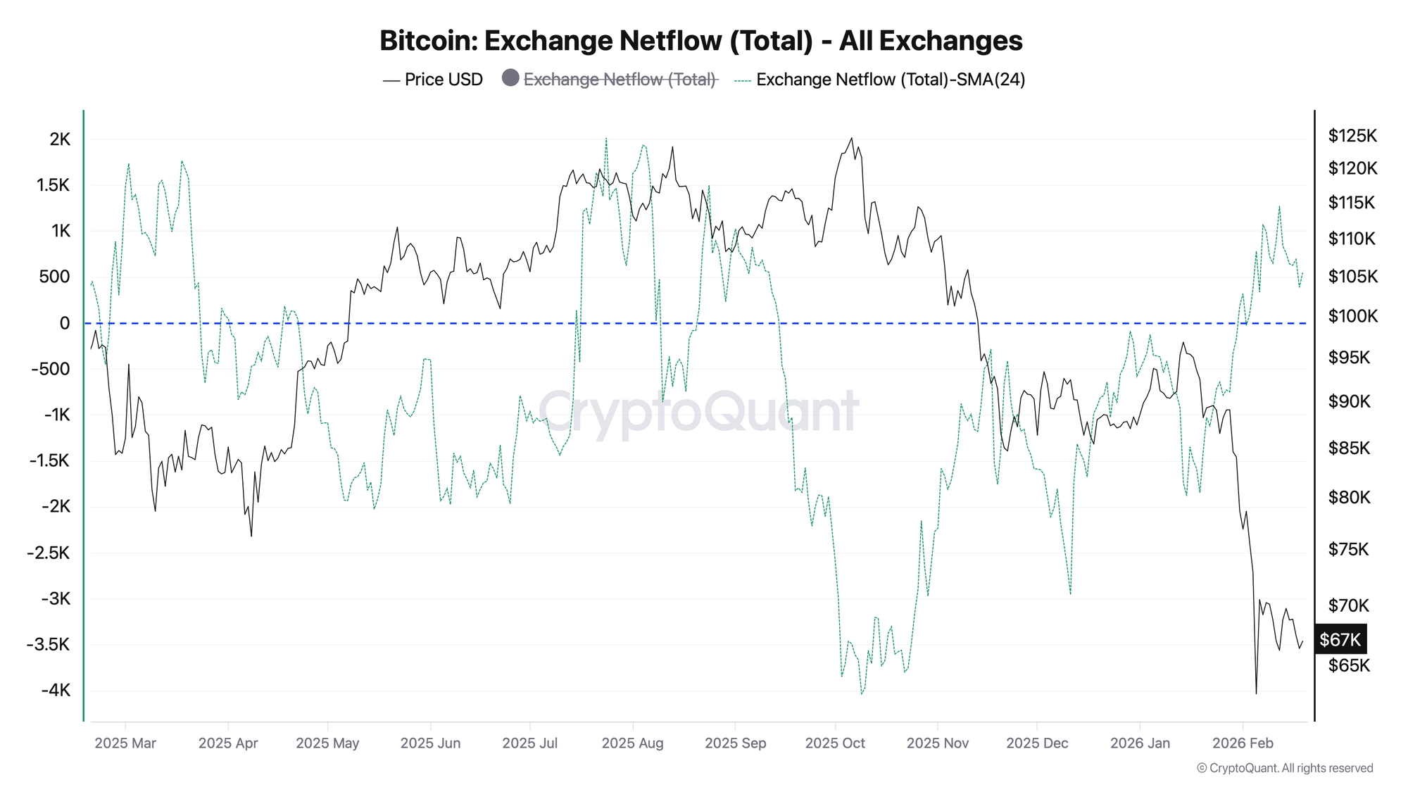 Metric: total Bitcoin netflow across all exchanges, smoothed by a 24-hour simple moving average (SMA-24), denominated in BTC.