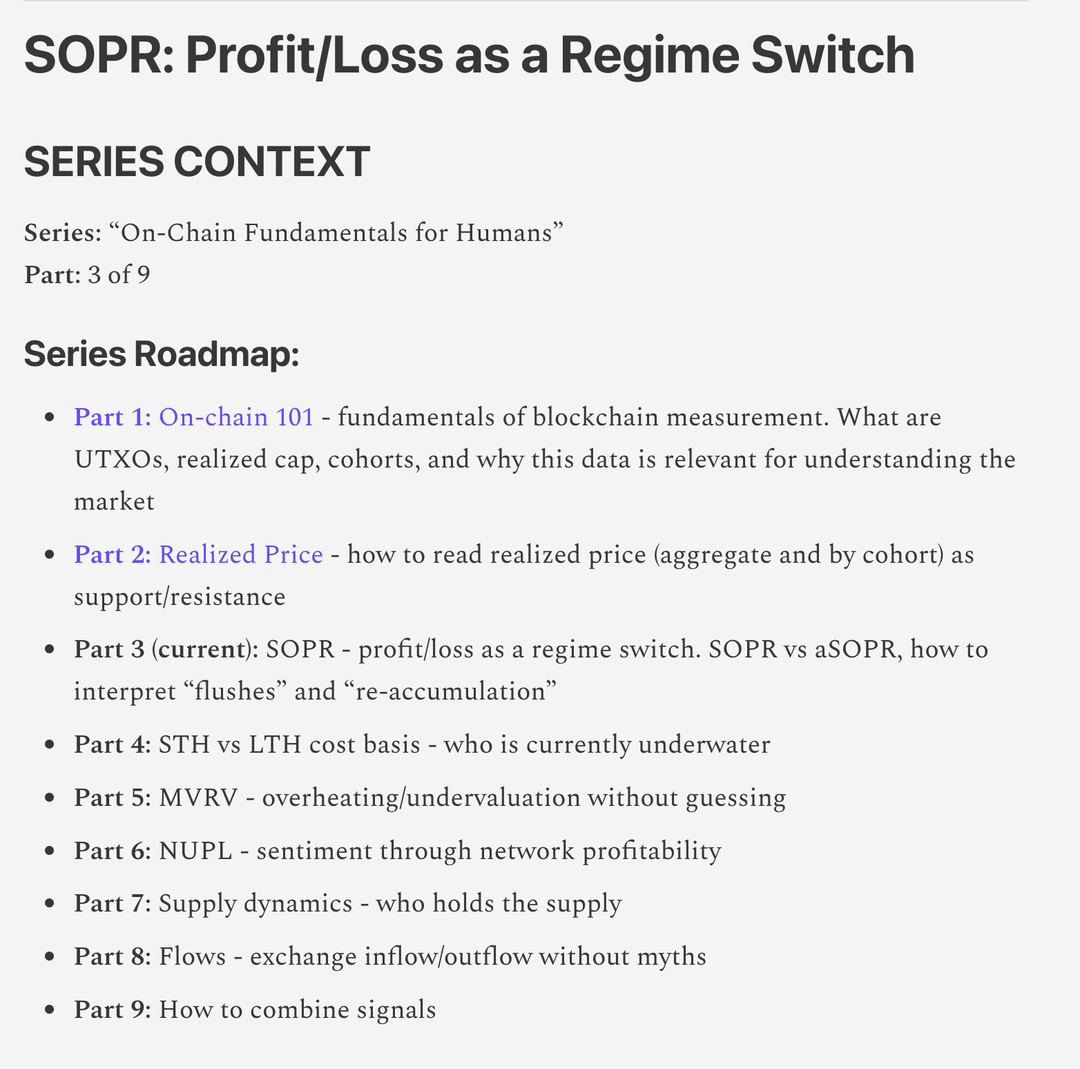 If you want to understand the analysis and learn to interpret data and extract alpha yourself, the Adler Edu section offers step-by-step breakdowns of each indicator: what it measures, when it works, when it lies. A full course on basic on-chain analysis is currently underway, and in the last lesson we studied SOPR. Start with the fundamentals - then the briefs will read differently.