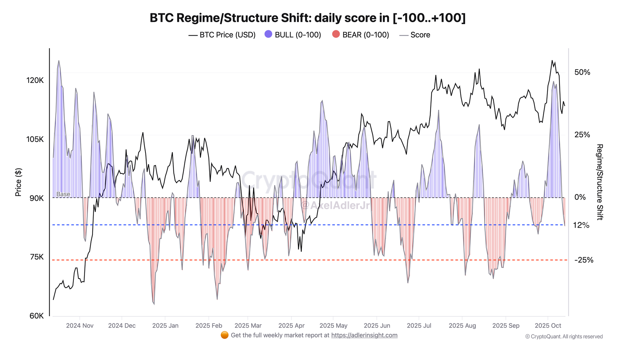 Bitcoin experienced a shock. The market structure index fell to −12%.