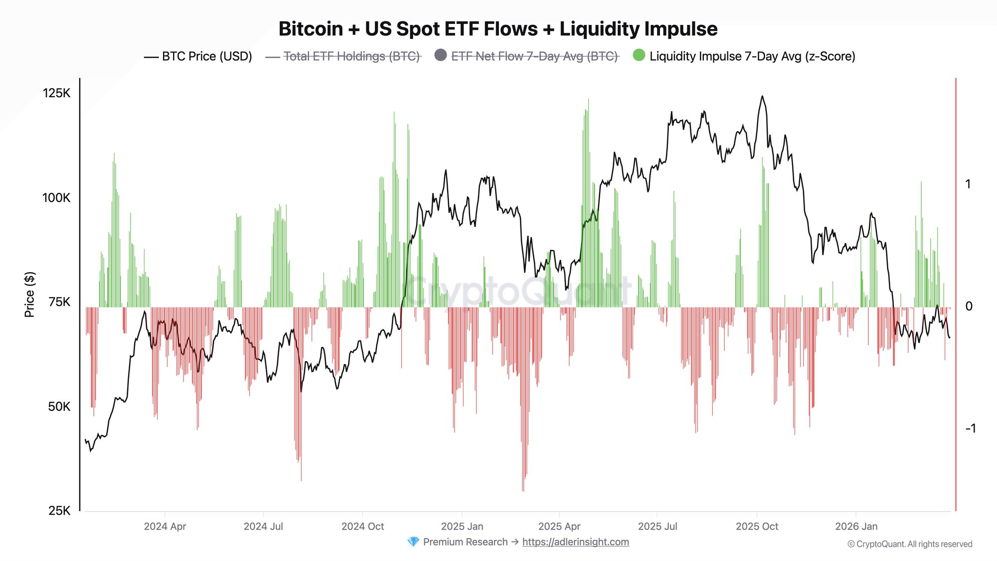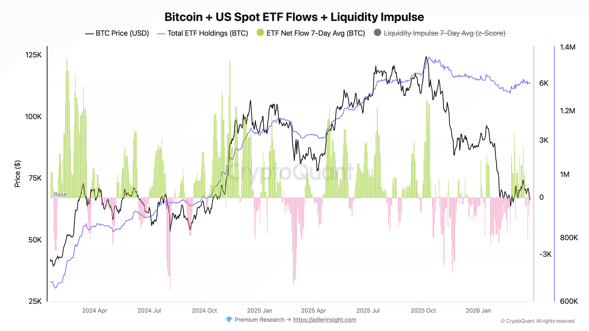 - Situation: ETF holdings ~1.28 million BTC; Net Flow 7d Avg around -215 BTC/day; Liquidity Impulse around -0.01
