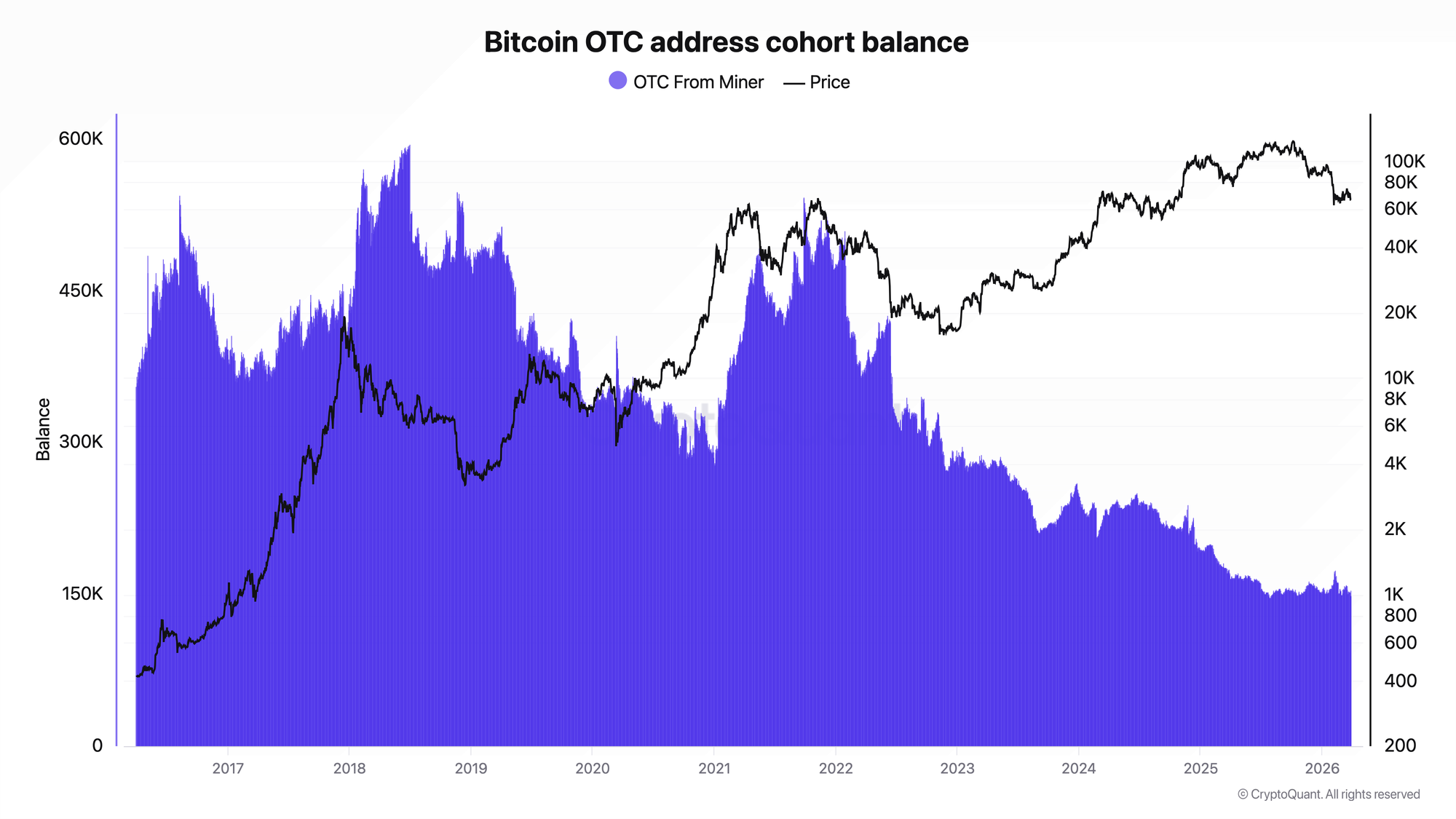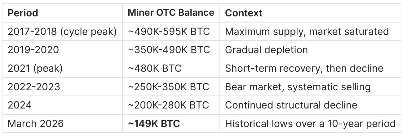- Miner OTC balance has declined from ~595K BTC (2018) to ~150K BTC (March 2026) - absorption without market impact