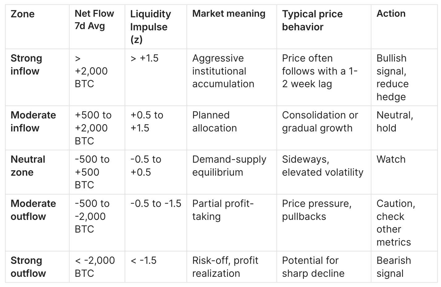 - Net Flow 7d Avg > +1,000 BTC (Liquidity Impulse > +0.5) for 5+ consecutive trading days