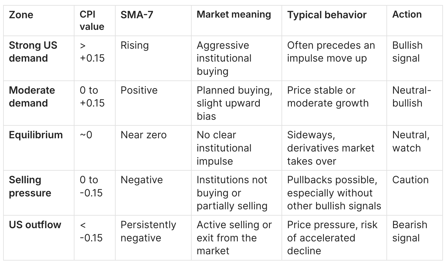 Problem: short-term CPI spikes may be caused by arbitrage bots, not real institutional demand. Solution: use SMA-7 instead of the daily value. The signal is meaningful if SMA-7 stays persistently above/below zero for three or more consecutive days.