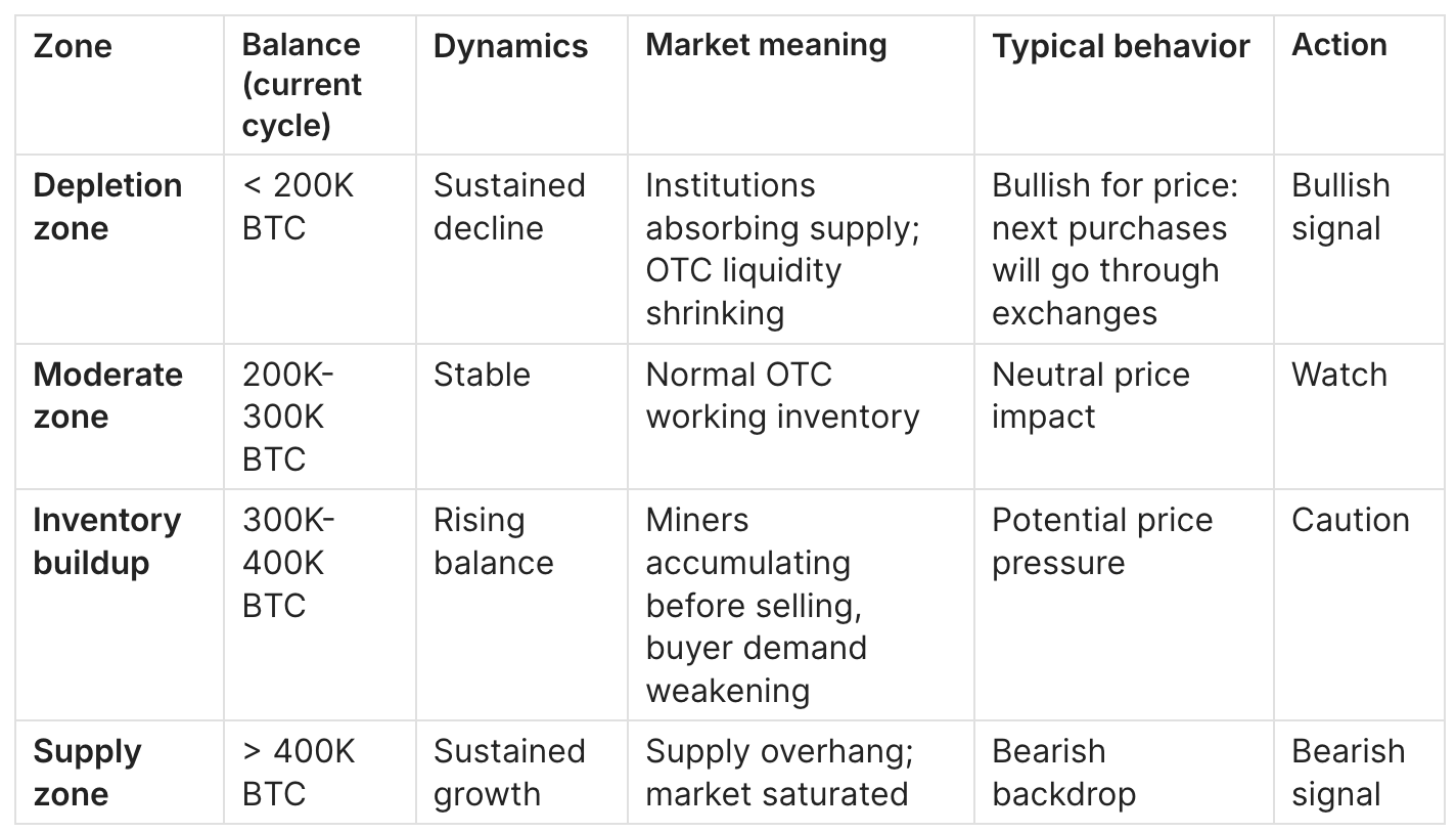 - Conclusion: the fastest period of OTC supply absorption in history; even during a correction (-44% from ATH) the balance continues to decline - a sign of structural, not speculative, accumulation