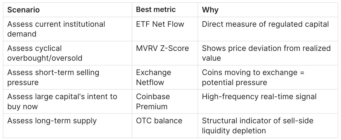 Each is reliable in its own context. Coinbase Premium is the most timely - it updates in real time. ETF Net Flow is the most transparent - it is based on public fund disclosures. Miner OTC balance is the most structural - it reflects long-term supply depletion. Combining all three significantly increases signal reliability.