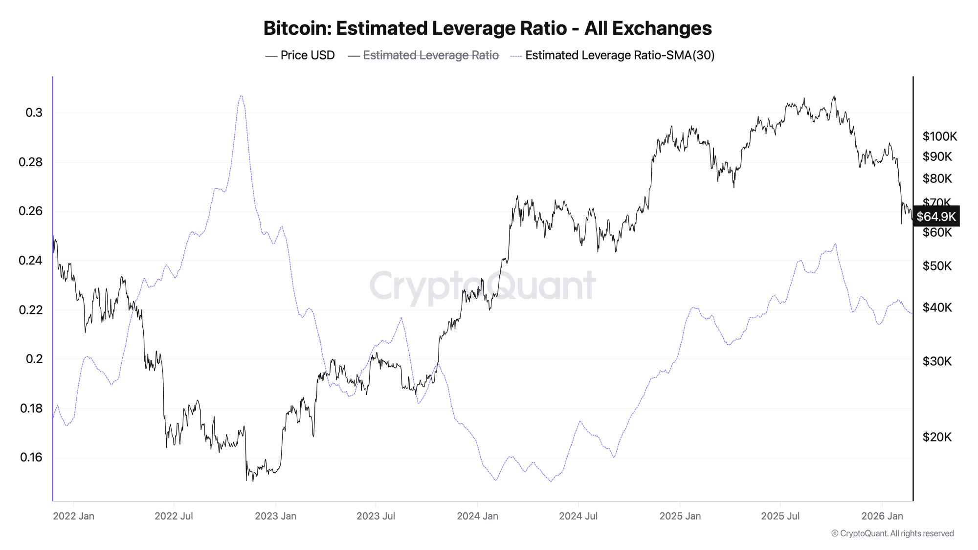 ELR = open interest in derivatives / BTC balances on exchanges. High values mean the market is driven by leveraged traders, low values mean the structure is predominantly spot.
