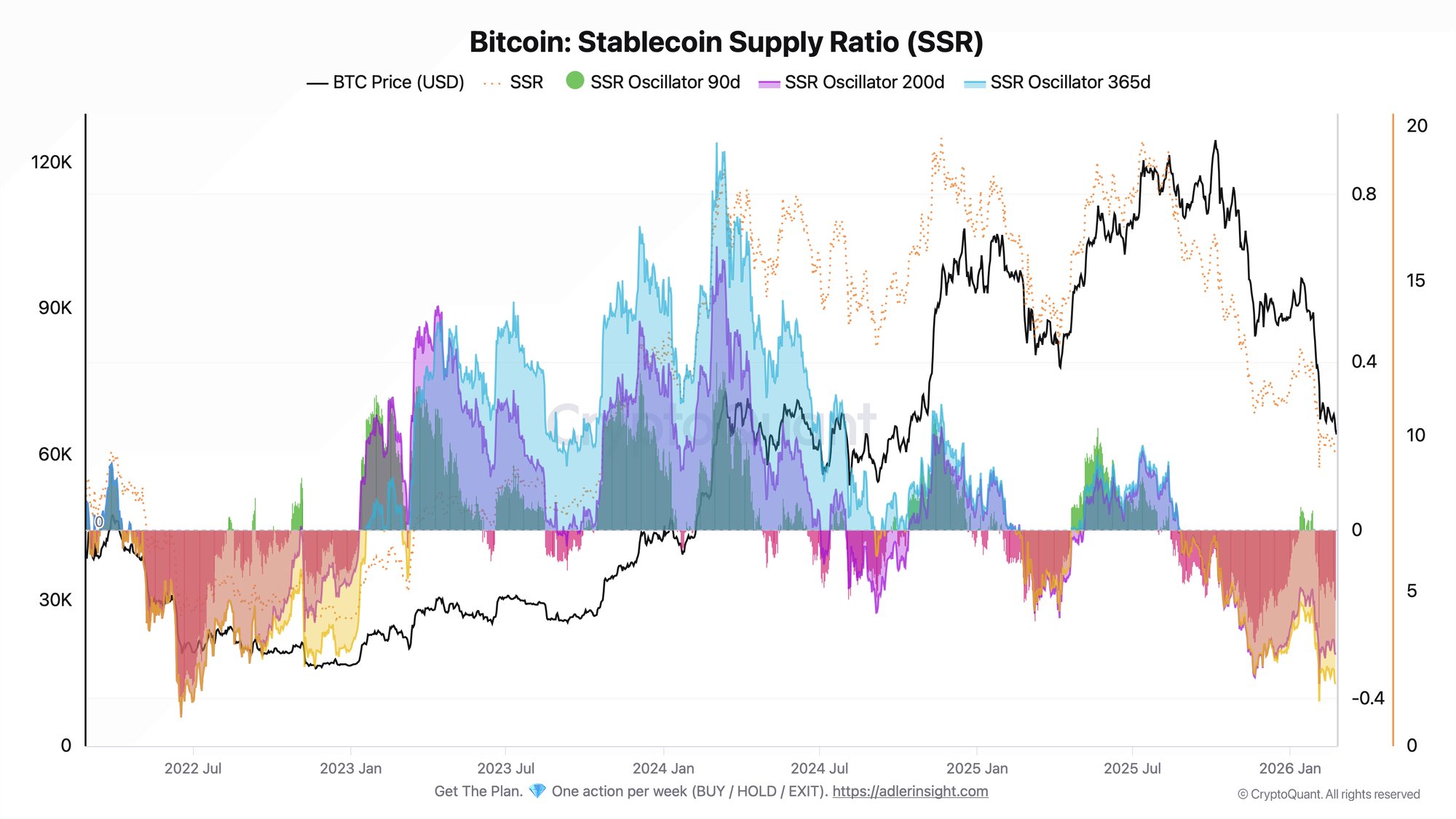 SSR = BTC market capitalization / USDT market capitalization. The metric moves together with BTC price: the cheaper BTC gets - the lower SSR falls. An oscillator below zero means the current SSR is below its moving average for the period - meaning USDT is relatively expensive by historical standards.