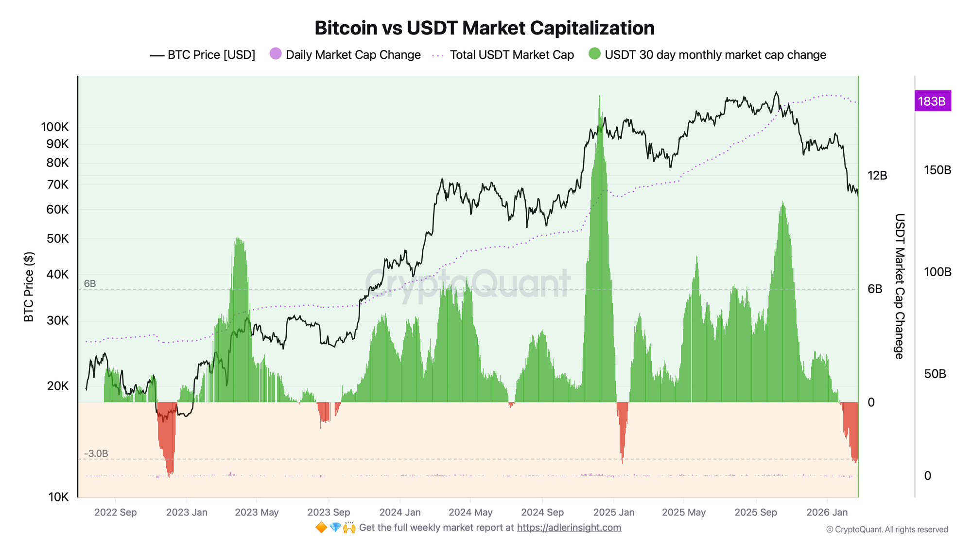 USDT capitalization peaked at $187.2B on December 30, 2025, and has since contracted by $3.6B to $183.6B. The 30-day change has remained in negative territory (-$3.08B) for 34 consecutive days - the last time sustained inflow above $2B per month was recorded was in early January. Over the same period, BTC corrected from ~$87.8K to ~$63.8K, meaning the price decline and liquidity outflow are moving in sync, reinforcing each other.