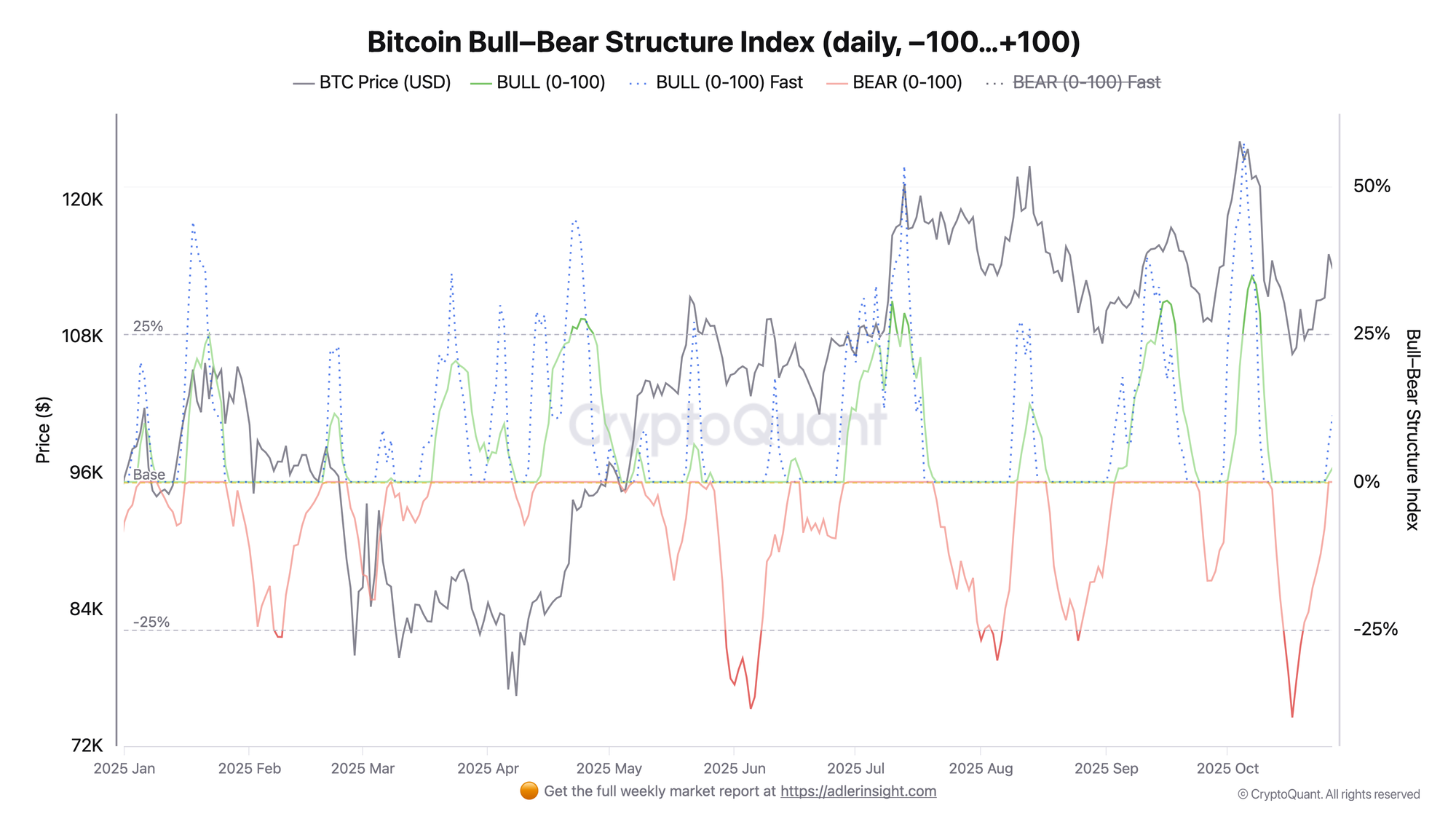 The index broke above the zero level for the first time since October 12, signaling a shift in balance of power toward bulls. BTC trading at $114K, and the Bull-Bear Structure Index (combination of market and on-chain metrics) returned to positive territory for the first time in two weeks. This technically means that the aggregate strength of buyers exceeded seller pressure across a wide range of parameters from derivatives positioning to on-chain metrics dynamics. The bullish component (green line) stands at +1.25%, the fast version of the index shows acceleration of bullish momentum at +10%, confirming a sustained reversal.