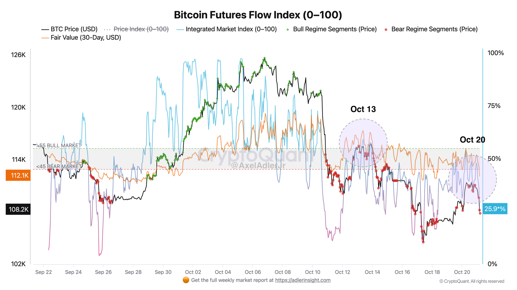 Bitcoin is in a bearish pressure phase following a series of large long liquidations on October 16-17 that cleared excessive leverage on derivatives. The current price of $107K has consolidated below the fair value of $112K, while the futures flow index remains in the bearish zone at 25% (threshold for bullish regime >45). The absence of new liquidation extremes reduces the risk of immediate cascading decline, however structural vulnerability persists.