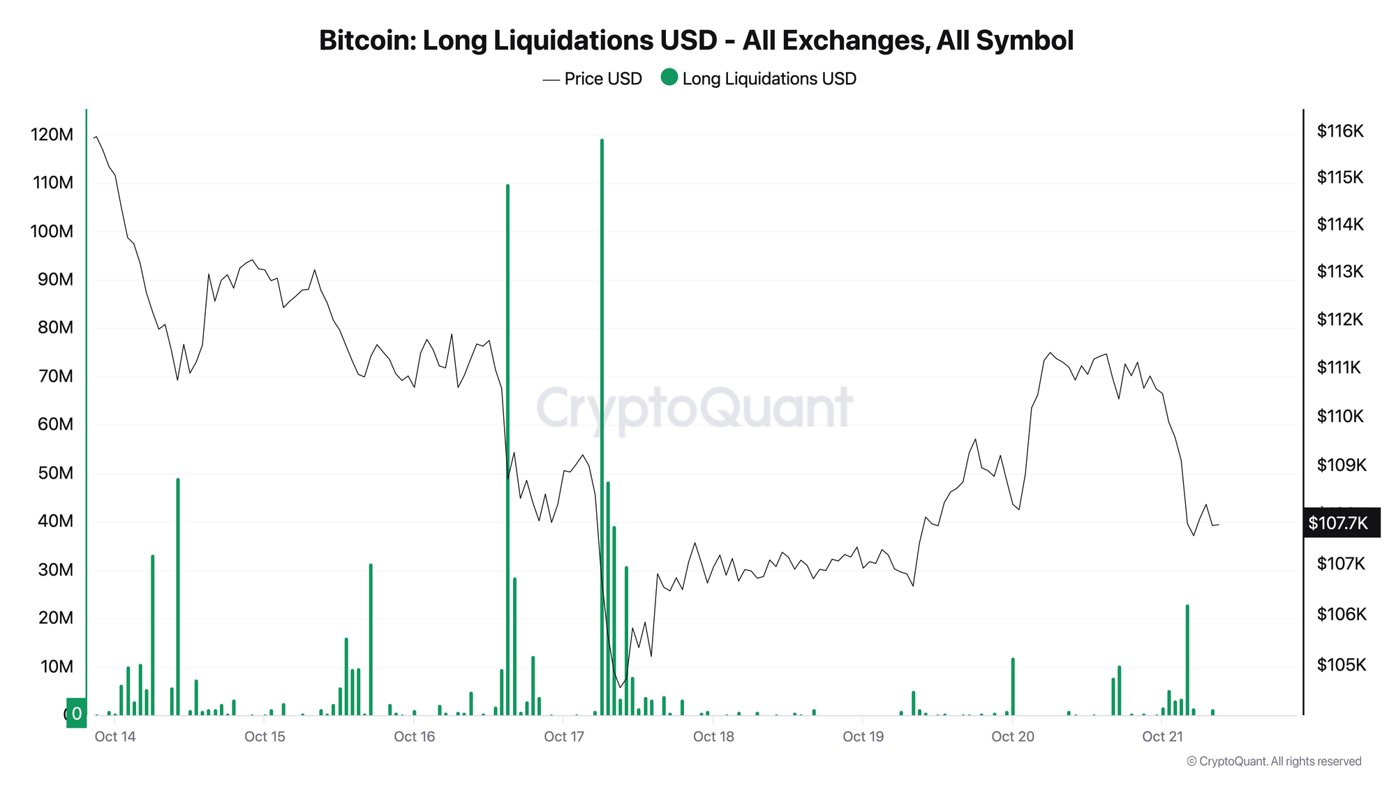 Large long liquidations on Oct 16–17 cleared part of the leverage; the absence of new extremes reduces immediate pressure, but below $112K the market remains vulnerable to repeated spikes.